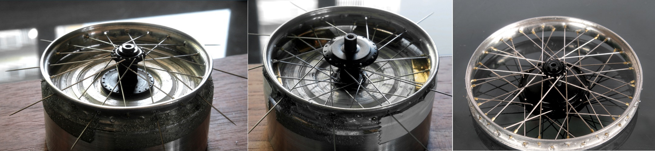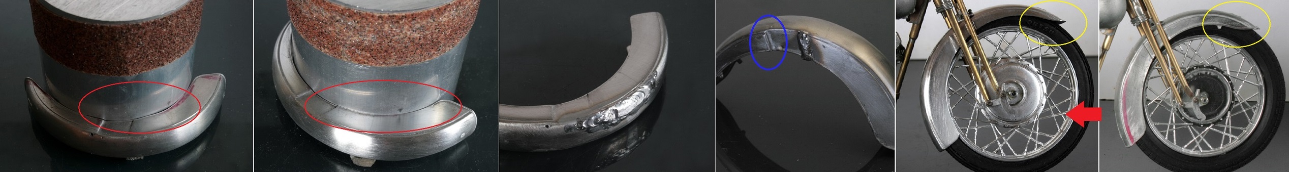 径を無理やり変えたので、フェンダーの内側(赤丸部分)も外側も綺麗な円にはなっていない。まず、内側は丁度同じような径になるアルミ棒に紙ヤスリを巻きつけて修正した。外側は半田を盛ってからそれらを削りながら修正。さらに、フロントフォークに挟まれる部分の位置が変わるので、そこも削ったり半田を盛ったりしながら修正した(青丸部分)。最終的に写真右のように修正完了。