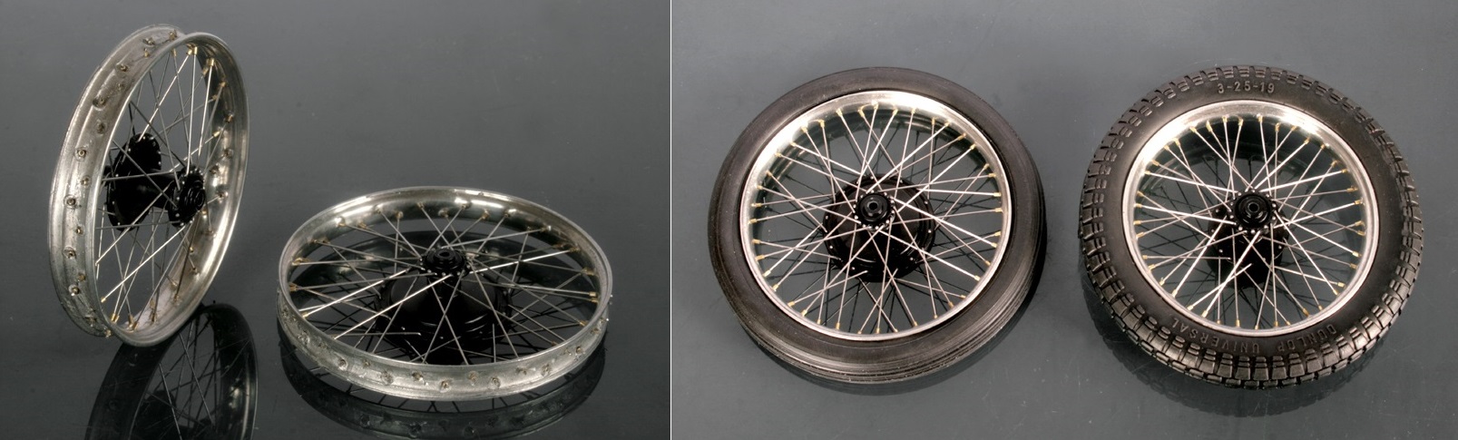 フレームの部品が大体できたので、全体の様子をみようとタイヤを当てて見たところ、なんとフロントタイヤの径が明らかに大き過ぎる!(写真左)このキットの完成品写真に真横からのものがほとんど無い理由はこれか!?