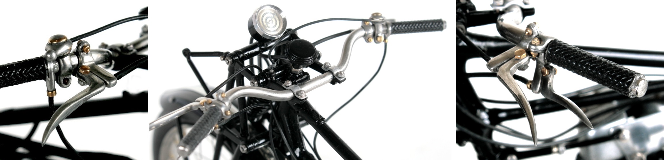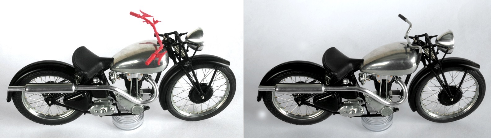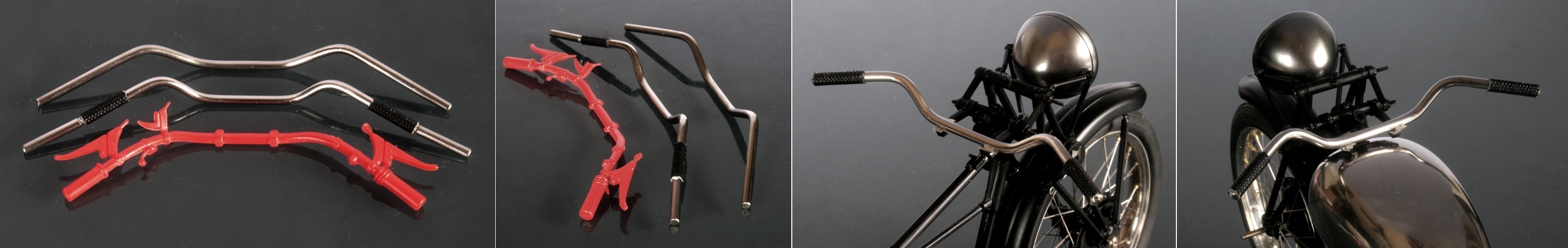 ハンドルバーは、径2.5mmのステンレス線を曲げて作る。2.5mmのステンレス線は、スロットカーのタイヤ軸用というものを購入してみた。1937年Tiger80のハンドル形状は、いくつもの写真を見ても、それぞれ違っていてどれがオリジナルだか分からない。少なくてもキット(赤)の形ではないことだけは確か。仕方がないので、いくつか作ってみて、良さそうのなものを使うことにした。