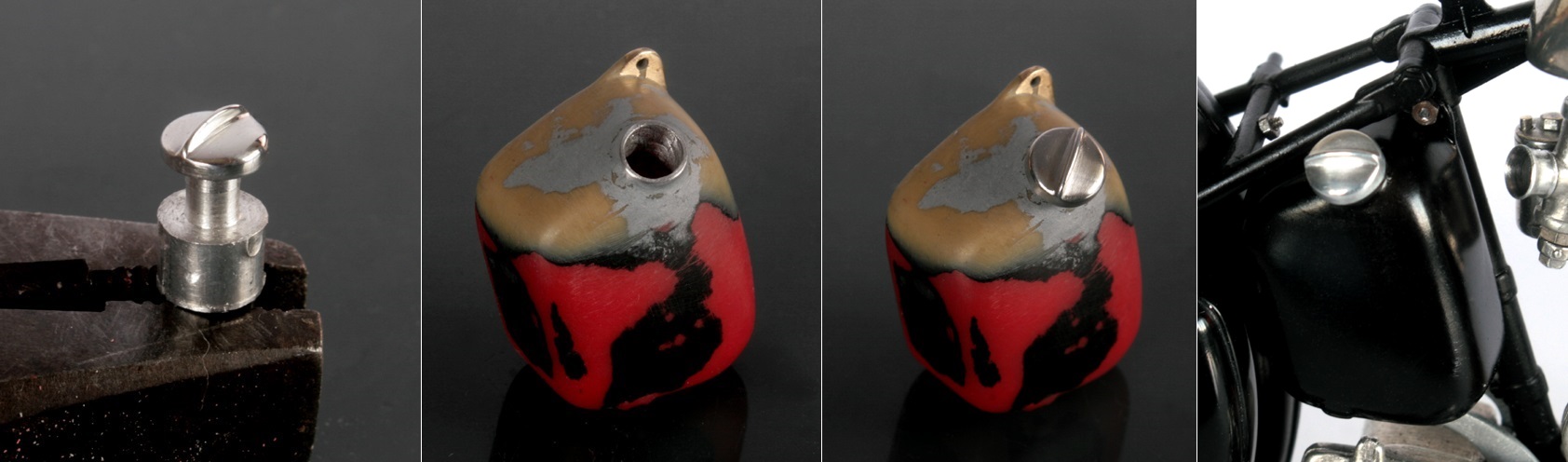 オイルタンクのキャップは、中央に取っ手(?)となる部分を残すようにアルミ棒を鉄ヤスリで削り、その後、旋盤で形を整える。オイルタンク側は5mmのアルミ棒で入口を作った。