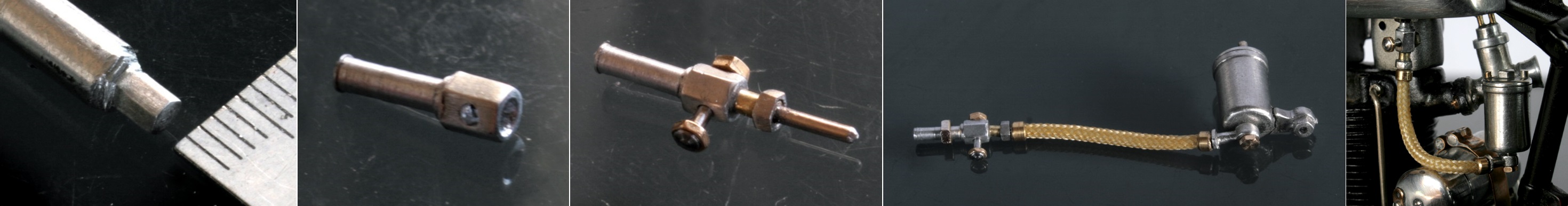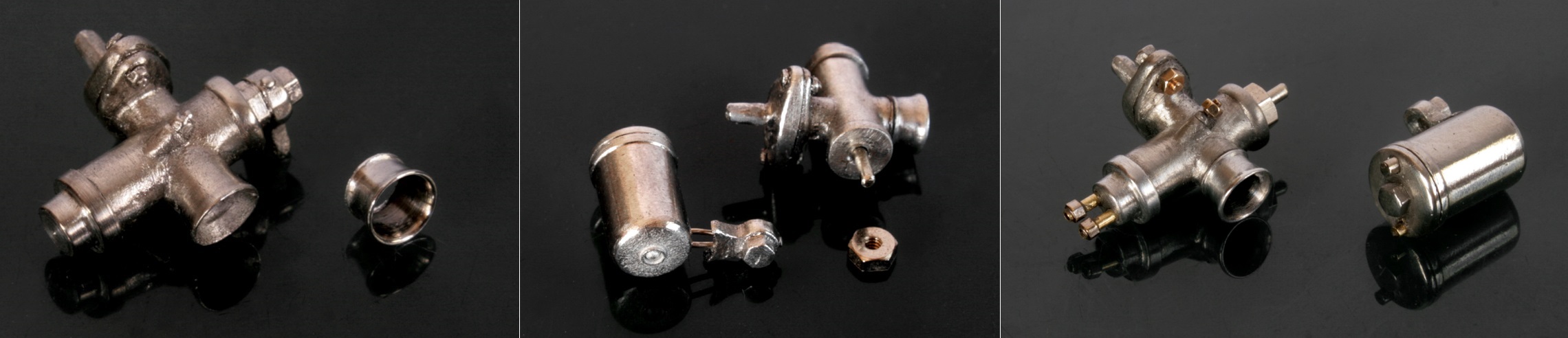 次にキャブレーターも修正。キットのものをホワイトメタルでキャスティングしてあるが、キャブの縦の長さが短いため、かなり小さく見えてしまうので、上部にアルミ棒を加工した部品を付け足した。さらにエアファンネルもアルミ棒を旋盤で加工。また、フローターがキャブ本体と同じ様に地面に対して垂直になるよう作られていたが、インテークマニフォールドの角度を上向きにしたため、そのままではフロータが斜めになってしまう。そこで、取り付け部分を斜めになるように加工し、ネジ類も追加した。