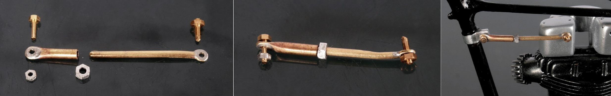 エンジンとフレームの間にあるステーを真鍮線と真鍮パイプで自作。3Hとはエンジンヘッドの形状が違うだけではなく、取り付ける場所も違うので、ダウンチューブ側の取り付け位置も上方に修正した。