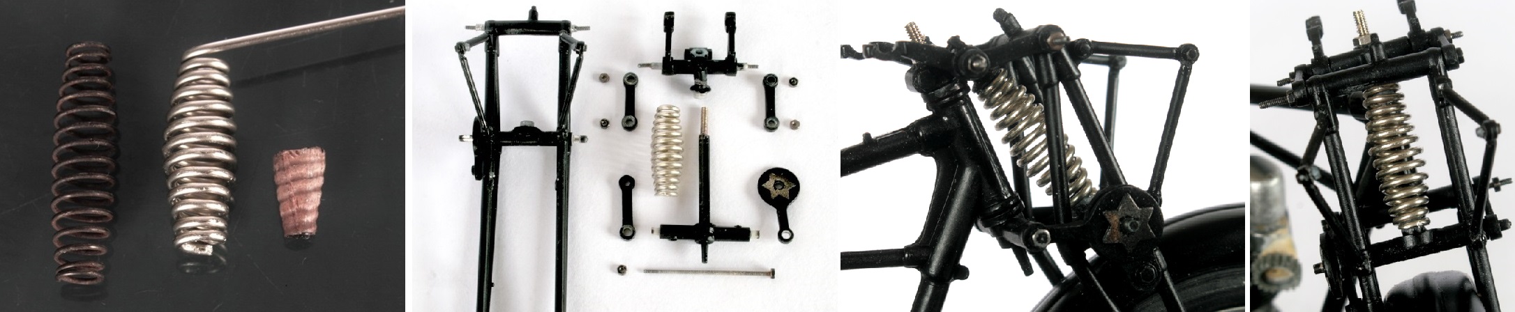ガーダーフォークのスプリングは、キットのものは余りにも細すぎるので、径1mmの洋白線を手巻きで自作。とは言え、中央が膨らんだスプリングを自作するのは難しい。鉛筆の先に洋白線を半分まで巻き付けた後、洋白線を90度折り曲げて残り半分を別途作成してから、元に戻して形を整えた。(この説明では分かりにくいですね)