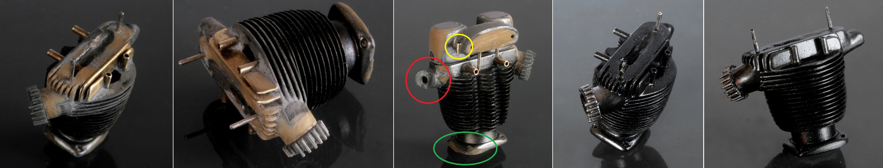 また、インテークマニフォールドが、軍用3HWではエンジンのほぼ真後ろを向いている(埃を吸いにくくするため?)のだが、3HやTiger80では外側を向いていてキャブが吸気しやすい(多分)ようになっている。しかも若干上を向いているので、そのように修正した。更にヘッドを留めるネジ穴も付け足した。