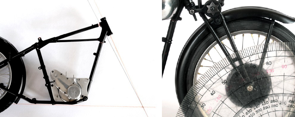フロントフォークが寝すぎている(キャスター角が大きすぎる)のだった。最初に実車写真とキットの仮組を合わせた時に、フレーム修正の必要なしと思っていたが、実は前輪が若干ずれており実際にはキャスター角度が違っていたのだった。仕方がないので、フレーム修正に入るが、エンジンを搭載するステーはもう作り直してしまったので今更変えたくないから、ダウンチューブは弄らない。ダウンチューブの取り付け部分を強引に曲げて(どうせタンクに隠れて見えなくなる)角度を2度ほど修正した。写真黒線が修正前の角度。赤線が変更する角度。たった2度でも随分印象が違う。