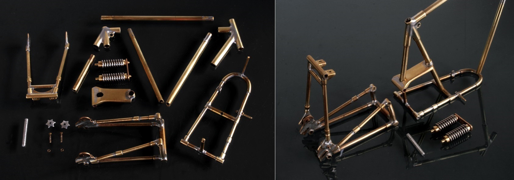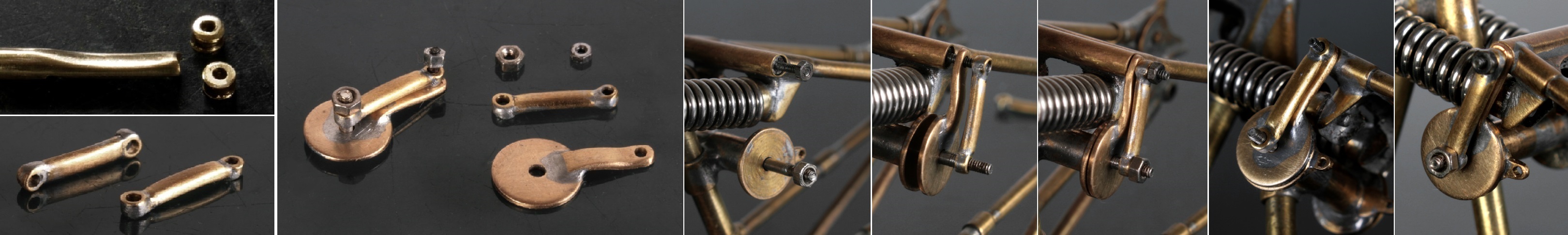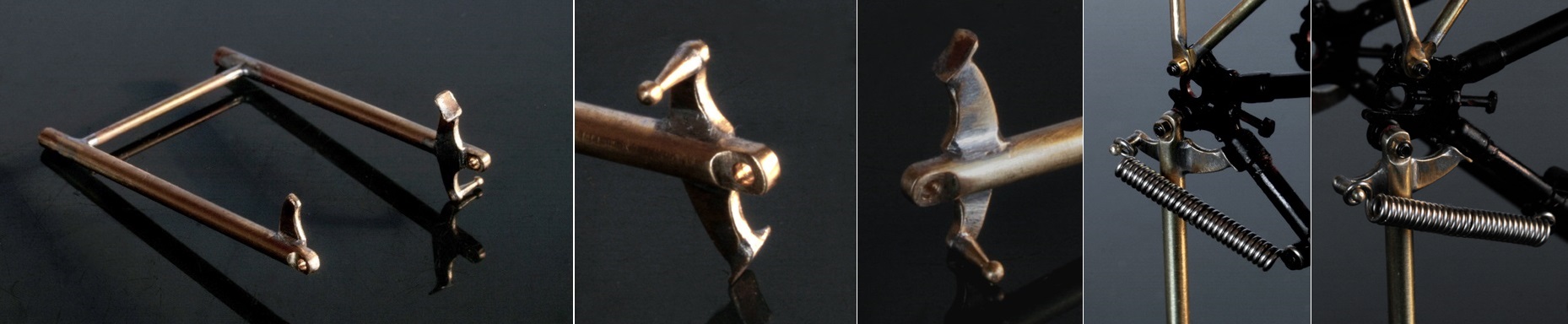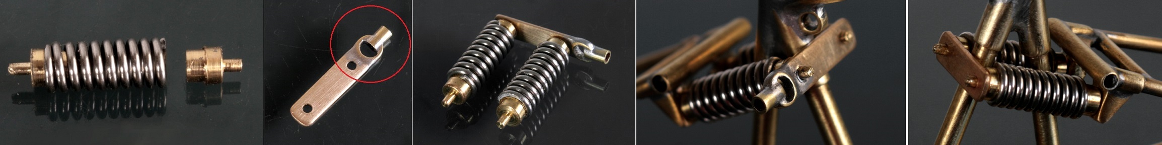 バネはキットのものを使用し、バネ両側の取り付け部分は真鍮棒を旋盤でひいて作る。また、2つのバネを支えるステーには、ギアチェンジの可動部を取り付ける部分があるので、真鍮パイプを輪切りにしたもので加工した。