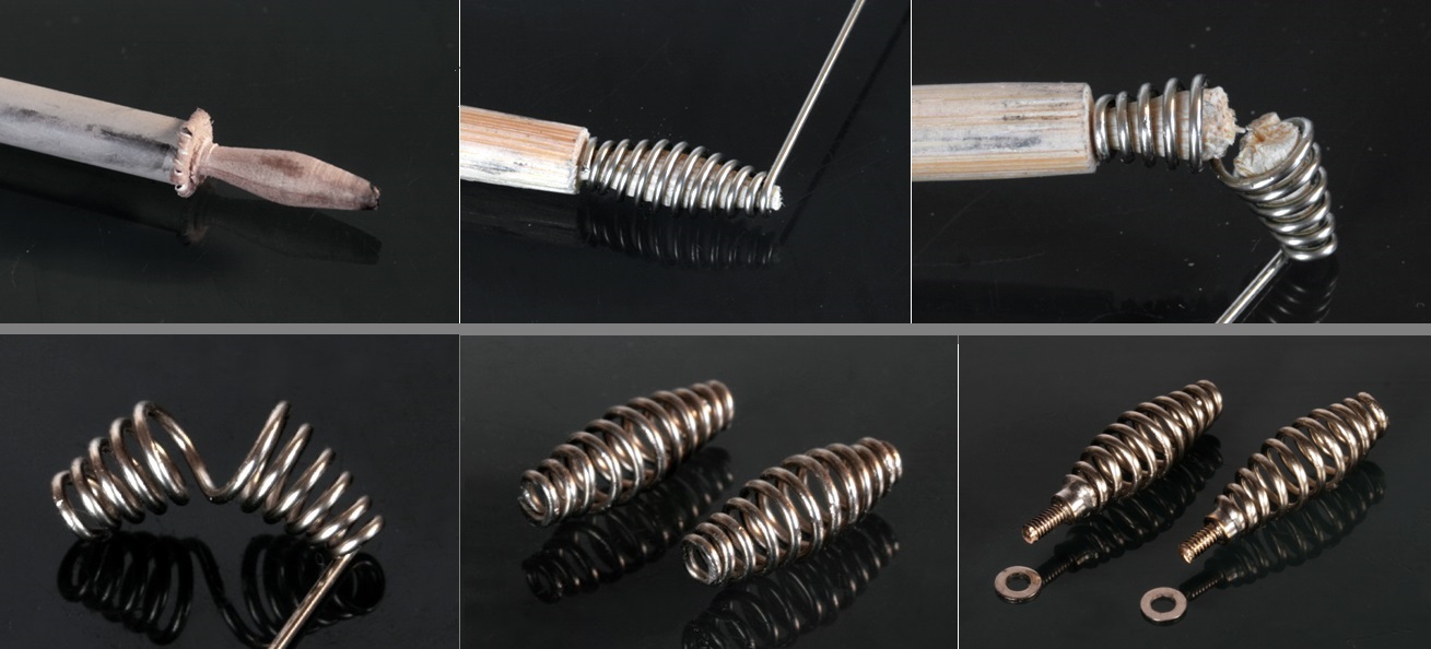 中央が膨らんだシート用のバネを作る。丸木を削って中央を膨らませた型を作り、そこに0.8mm洋白線を巻いていく。巻き終わったら真ん中でポキッと折り、型にした木を取り除く。その後、成形してバネの出来上がり。フレームに留める部分はM1.6のネジをハンダ付けした。