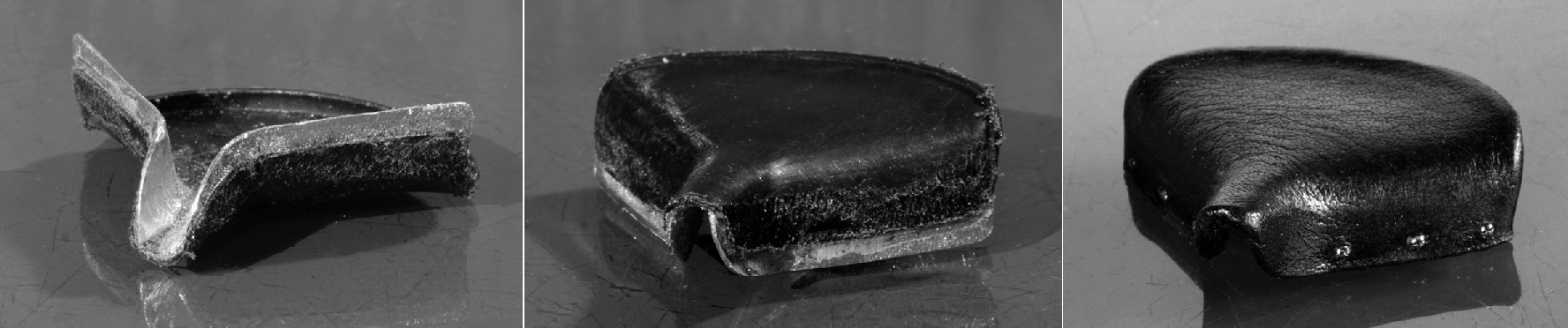 キットのシートは非常に良い形をしているが、高さが少しだけ足らないので、0.4mm厚のアルミ板を足した。黒革を張り、留めネジを埋め込んでシートの出来上がり。