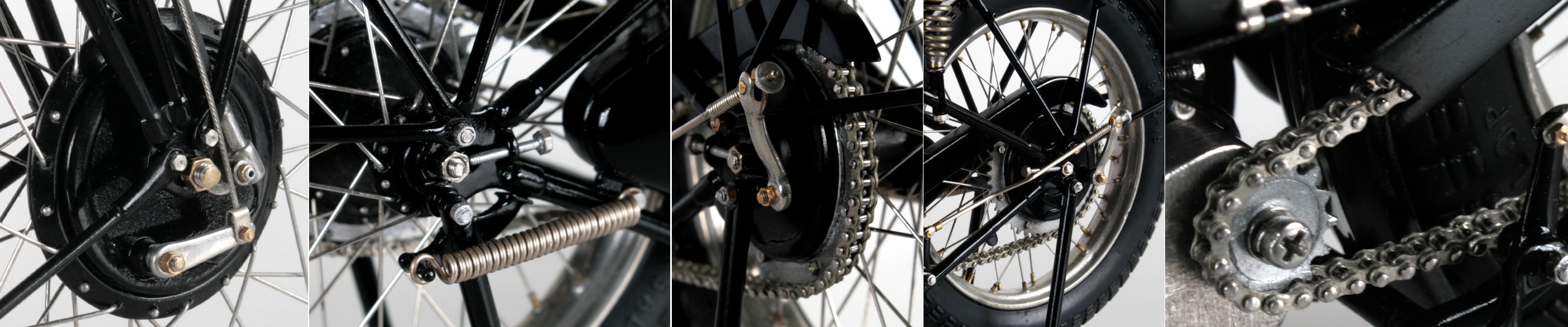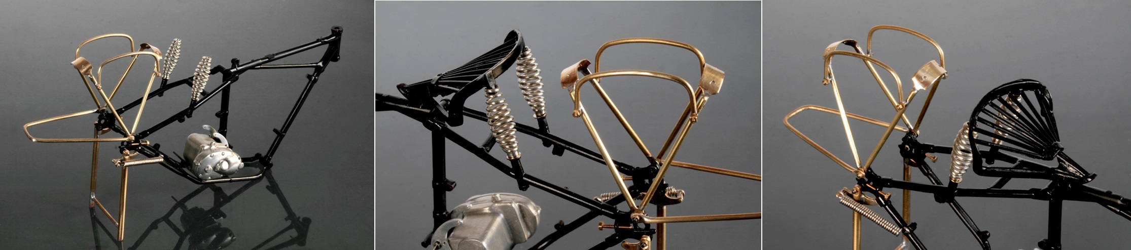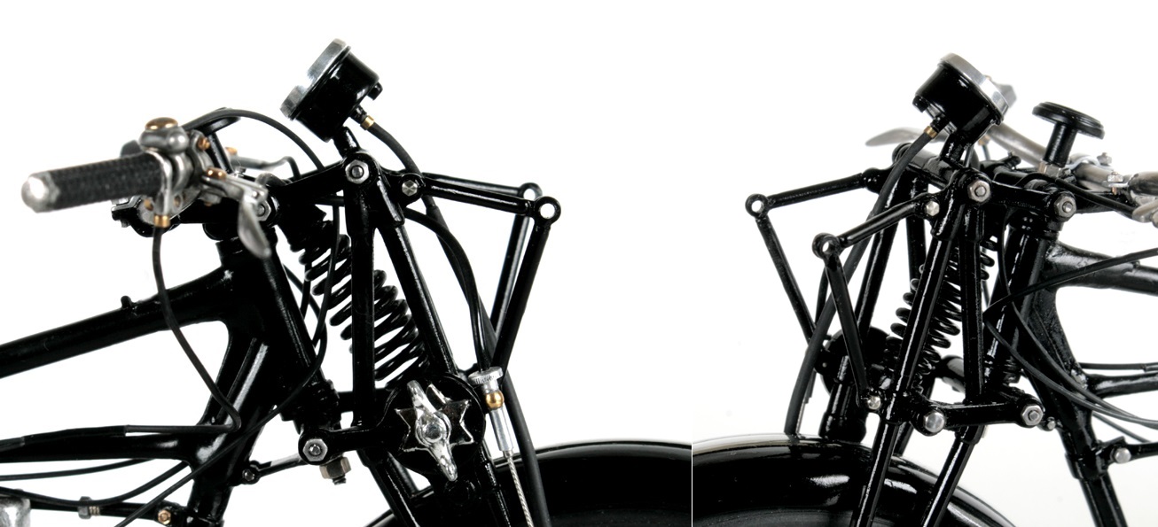 洋白線のバネは手頃な跳ね返り感があり、六角ボルトとナットで組み立てたガーダーフォークは実車のように可動して気持ちよい。