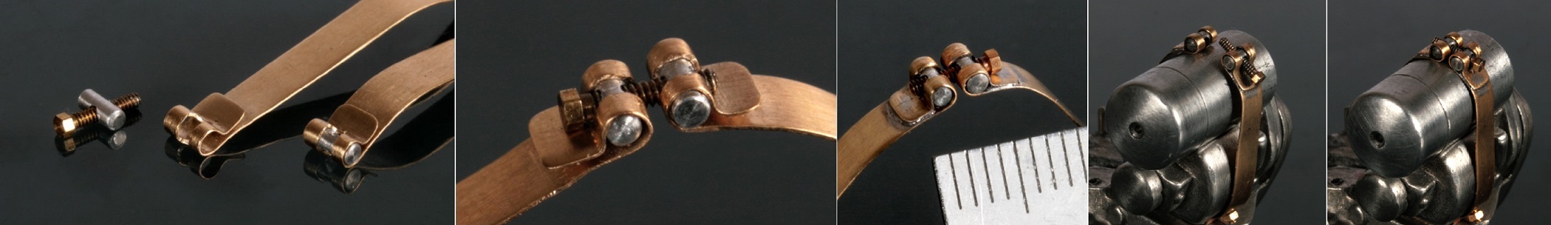 次にマグネトーを取り付ける留め金を真鍮版で自作する。六角ボルトを通す部分はΦ1.5mmほどのアルミ棒。