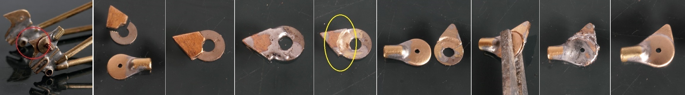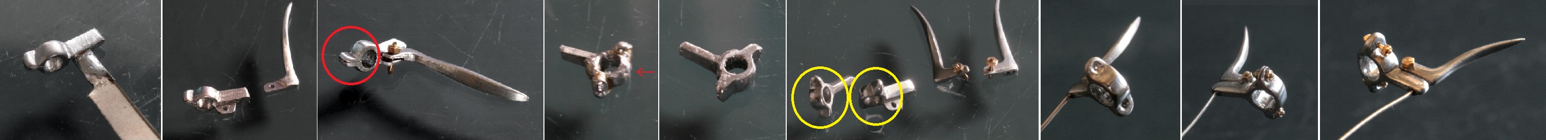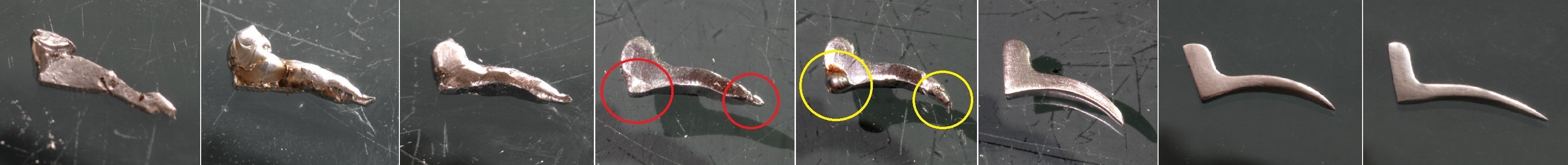 途中、成形するのに盛りが足らない部分(赤丸)にハンダを付け足し(黄丸)、更に削っていく。1937年頃のレバーは非常に細長いので実車写真を見ながら形にしていく。