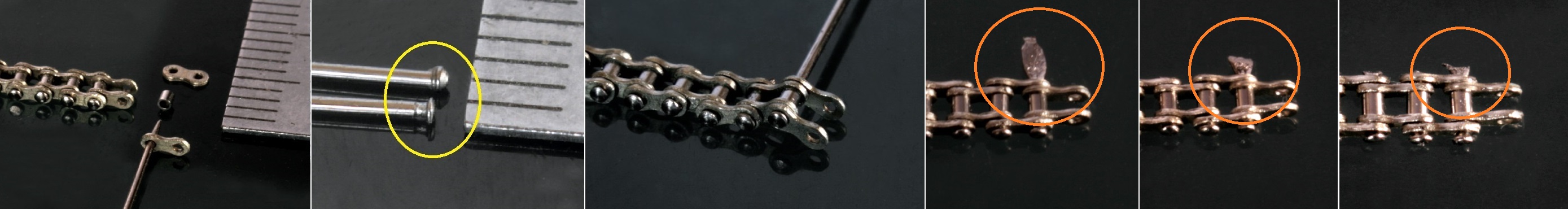 潰した後、その部分をルーターで削っていくが、チェーンのコマが外れないように突起を残して削る(オレンジ丸)。最終的に角は落とす。