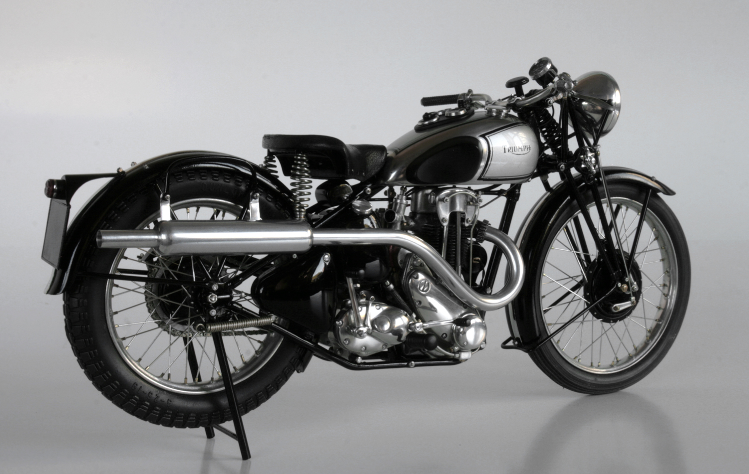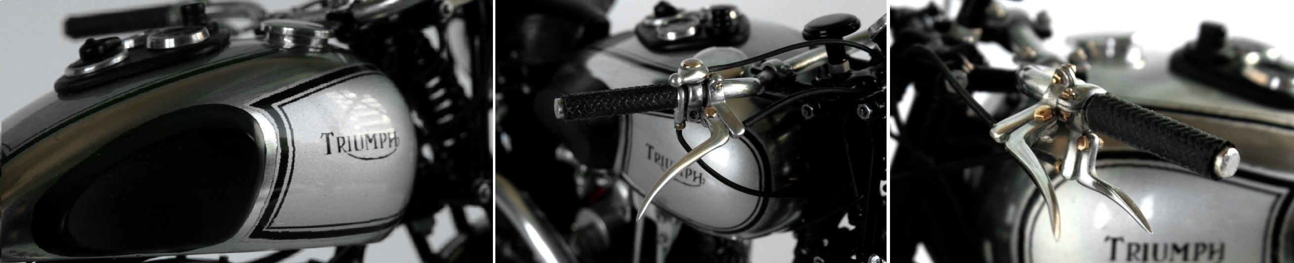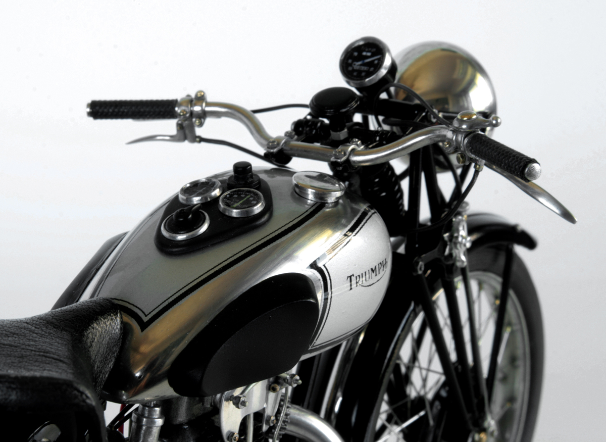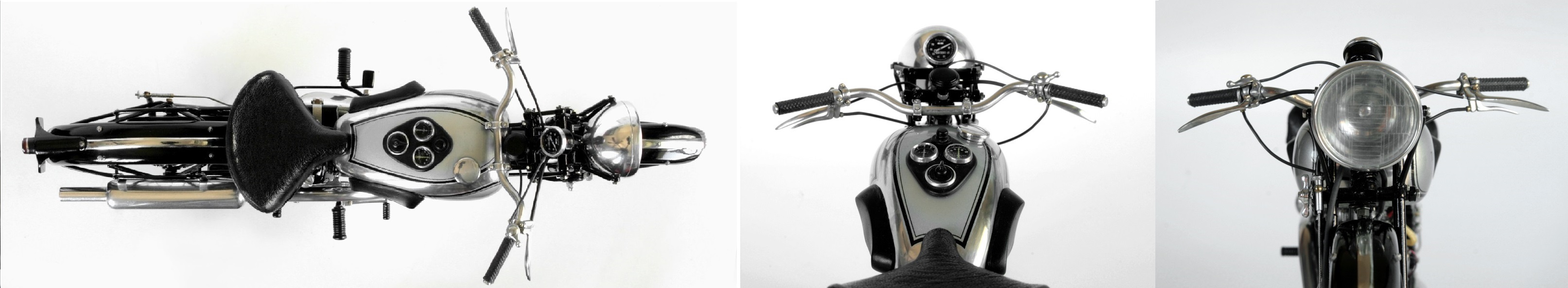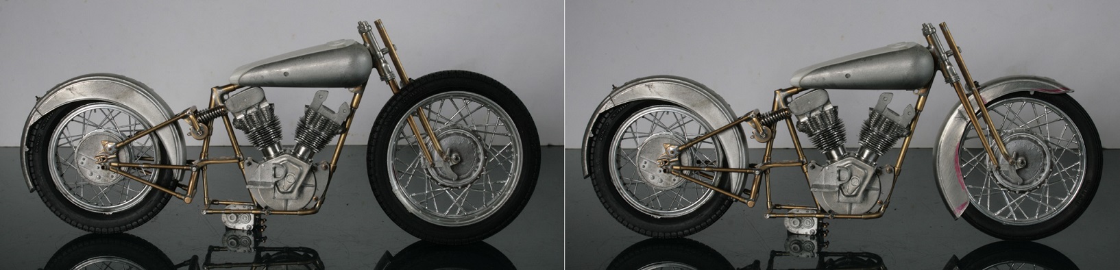 ところが1937年のSpeed Twinのオリジナルとしているいくつかの写真では、ほとんど同じ形状をしており、その後のTiger100までほぼ同じ形状が使われているらしいと気が付いたので、再度作り直した。ステンレスが固くて、曲がり方がちょっと鋭角になってしまったが、まぁ、こんなものか。