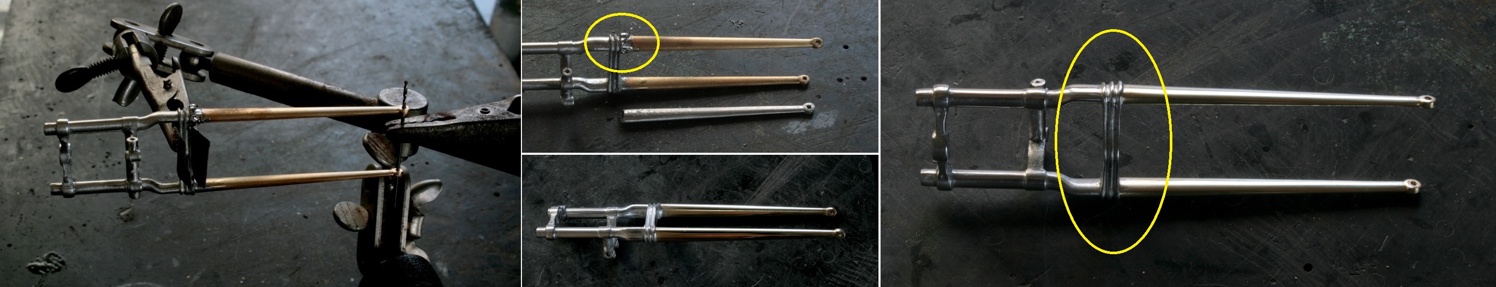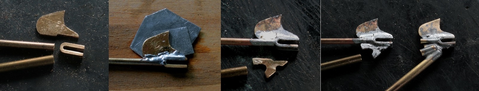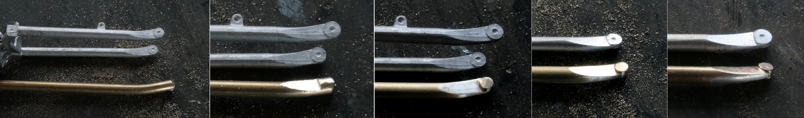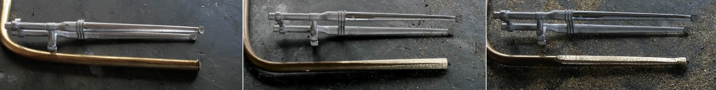 フォークの先が曲がっているので、真鍮パイプのままだと綺麗に曲げられない。そこでパイプに2mmの銅丸棒を突っ込み半田付けしてから曲げる。その後、鉄ヤスリで整形。