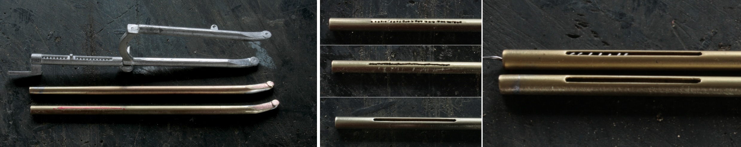 また、フォークの切れ込みも上部にまで拡大する。緑丸印の部分は、キャップを嵌めるための長さが足らなくなったため、2.6mm真鍮パイプを継ぎ足した部分。