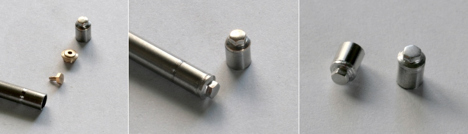 次にフォークのキャップを作る。キャッスルフォークの構造を知らなかったのだが、ネットで調べてみると、上側のフォークを上から差し込み、その後、キャップで留める構造になってる。キャップはφ3mmのステンレスパイプ。その蓋は真鍮丸棒を旋盤で削りだし、六角ナットをつける。さらに半田でメッキ加工した。