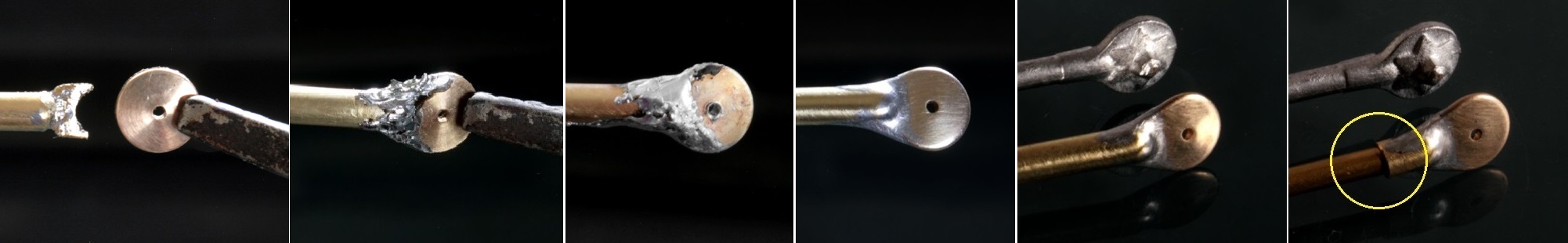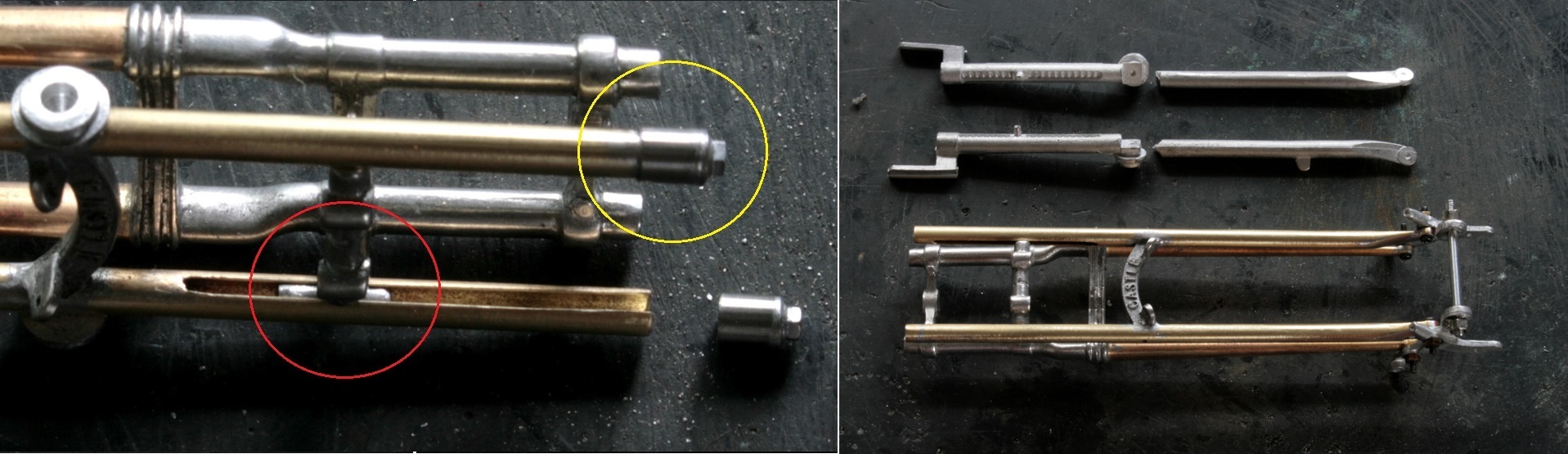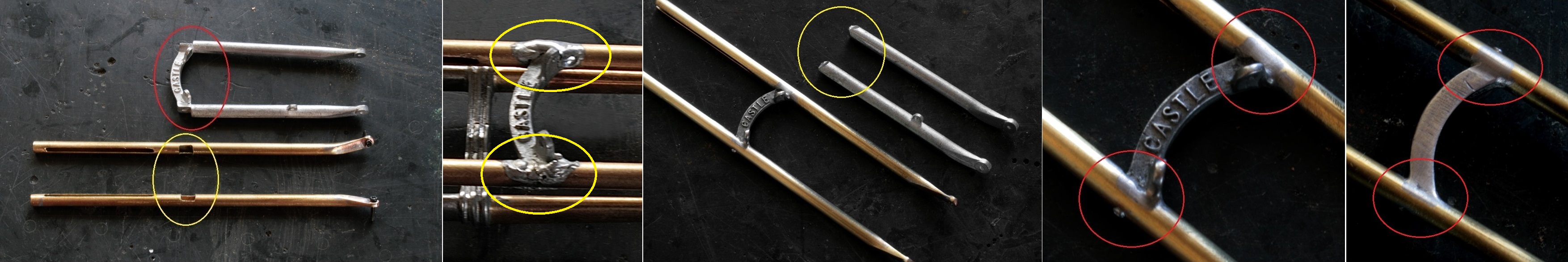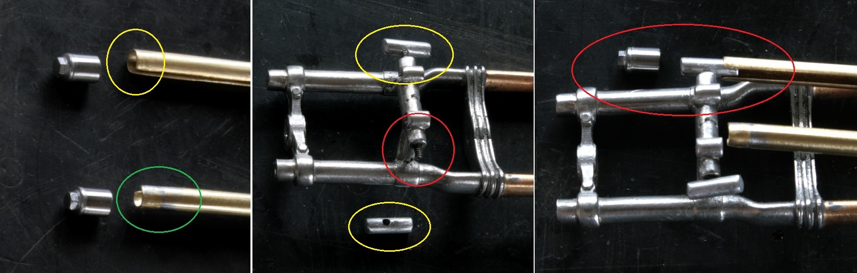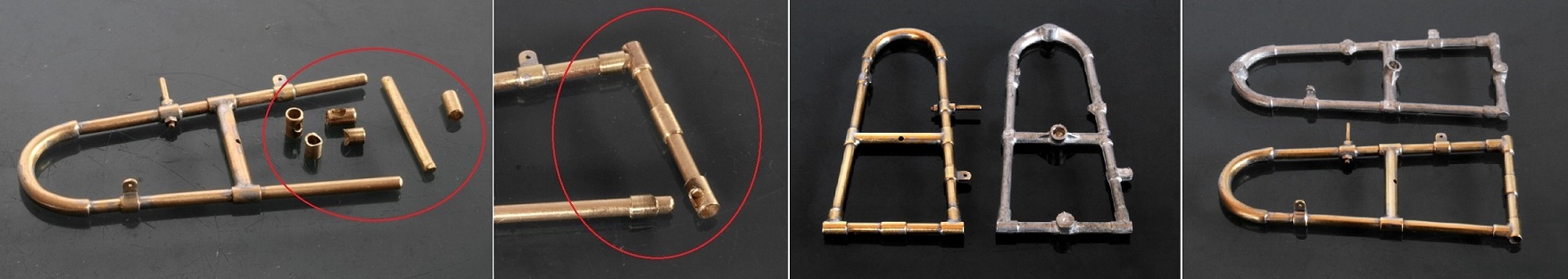 φ2mmの真鍮棒とφ2.6mm真鍮パイプを組み合わせて組み付けていくが、真鍮パイプの端は取り付ける側の棒の丸みに合わせるようにアールをつけて(赤丸)削っておく。真鍮棒の端はΦ1mmになるように旋盤で加工し、穴に挿し込んで(青丸)組み合わせてからハンダ付け。