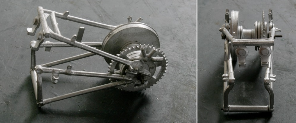 とりあえず、リアサス有り仕様で作り始め、最後にマフラーをどうするか考えることにした。ただ、左側にマフラーを出すとなるとオイルタンクの形状も変えなければならないんだけれどね。