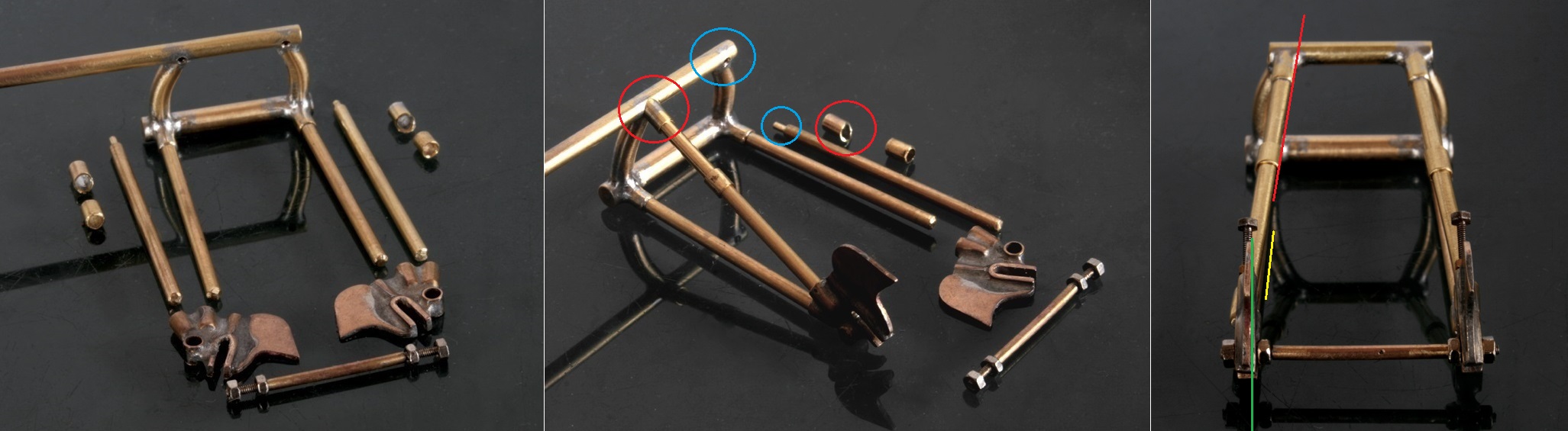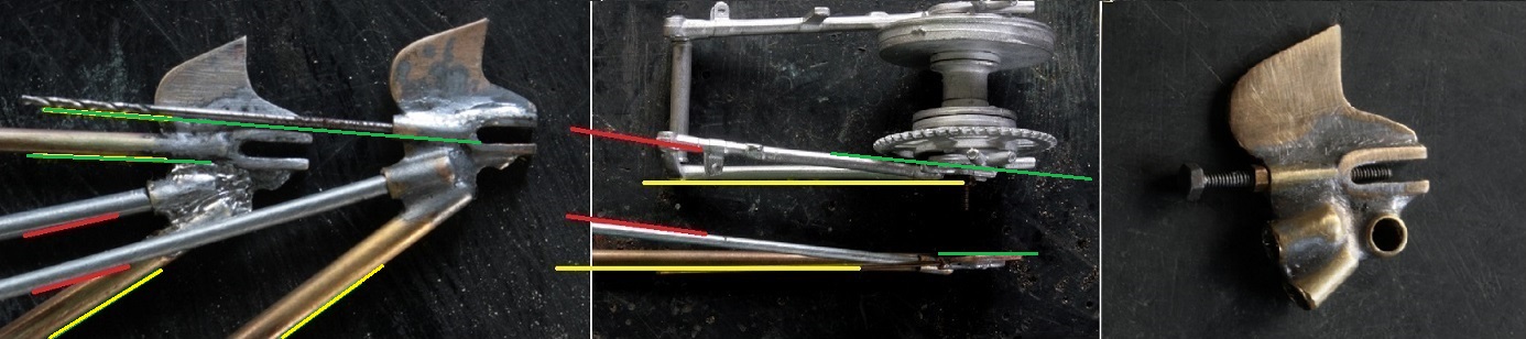 真鍮パイプを全部で3本(緑:車軸アジャスター用、赤:上部ステー用 黄色:下部ステー用)着けなければならないのだが、左右の角度を揃えることはもちろん(写真左)、上から見たときに3本の角度が全部違っているのでそれを合わせなければならない(写真中)。