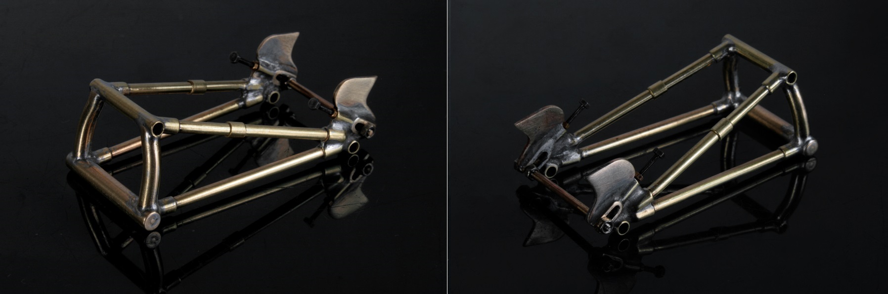 様々なステーを取り付けて完成。キットの部品は柔らかいだけでなく、合わせ目が出てしまうだが、真鍮棒などで作り直すと、真円で歪みのないフレームとなる。