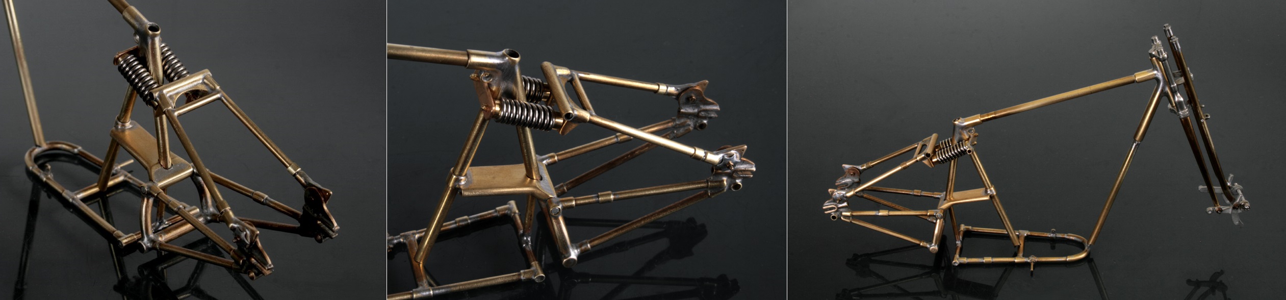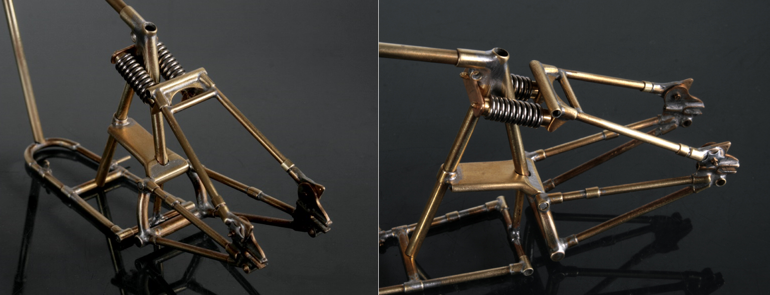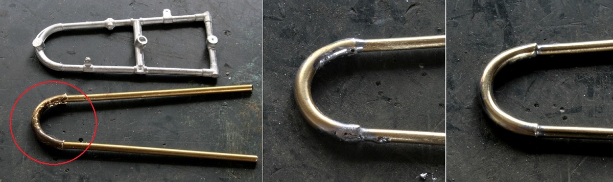 次にメインフレームの下部も重量に耐えて歪まないように作り直す。Φ2mm真鍮棒にΦ2.6mm真鍮パイプはリアと同じ。赤い部分は真鍮棒に真鍮パイプを通しておいてペンチで無理やり曲げた結果、傷だらけになってしまっているが、そこは半田を盛って修正する。