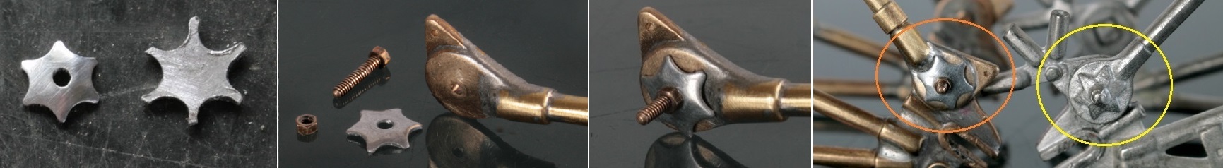 更に星型のナット(これがナットの役割をしていると初めて知った!飾りだと思っていた)をアルミ板を鉄ャスリで削りながら作る。僅かに湾曲しているので、ゴム板に乗せてビー玉を押し付けて加工。キットと比較すると、エッジもたっていい感じになった。