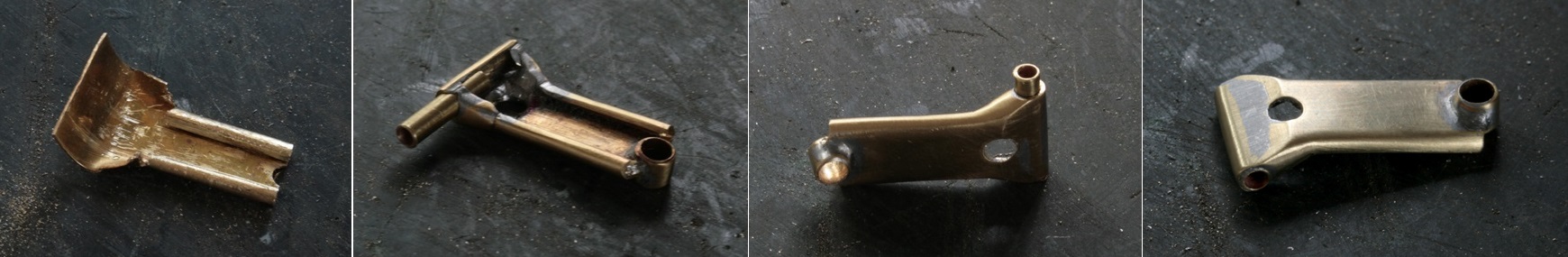 次にリアサスをメインフレームに取り付ける部分のステーを作る。0.4mm厚の真鍮版をペンチで折り曲げながら加工。リアサスを可動させるため、Φ2.6mm真鍮パイプを埋め込み整形する。