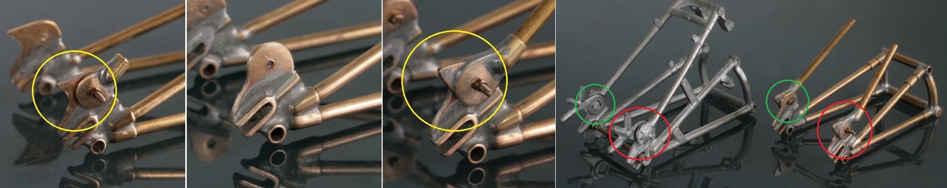 ハンドルに取り付けるステーもハンダ盛りで作成し、レバーを取り付ける部分は洋白板をハンダ付け。ところが、ハンドルに六角ボルトで取り付ける部分の位置が違うことに気がついた(赤丸)。ステーに対して垂直に2箇所ネジで留める部分を付け足した。(黄丸部分がその完成箇所)