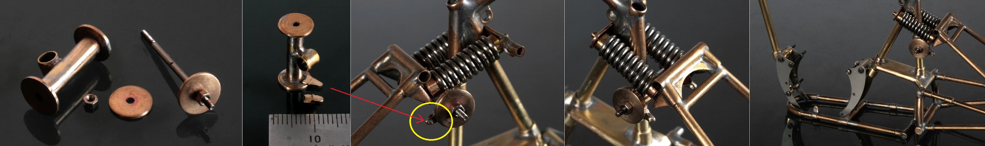 次にリアサスペンションの可動部を作る。Φ6mmの円盤にΦ2.6mm真鍮パイプのエッジを潰して円盤を半田付けできるように加工。半田付けの後、整形しΦ2mmの真鍮棒をステーとして挿入できるようにする。