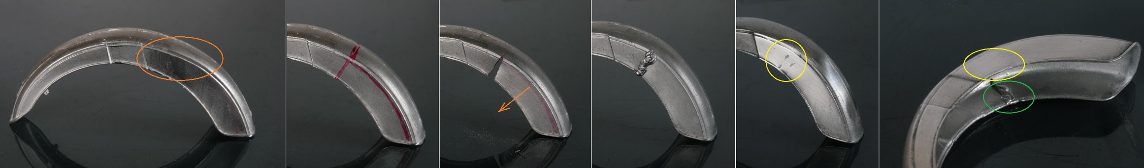 キットのフロントフェンダーは、写真の一番左(橙色の丸)で分かるように途中から径を変えたかのように相当歪んでいる。そこで、赤ラインとなるよう途中に切れ目を入れて径を小さくすることとした。フェンダーが薄いのでホワイトメタルを溶かさないように温度調節しながら半田を盛っては削り…を繰り返して修正した。