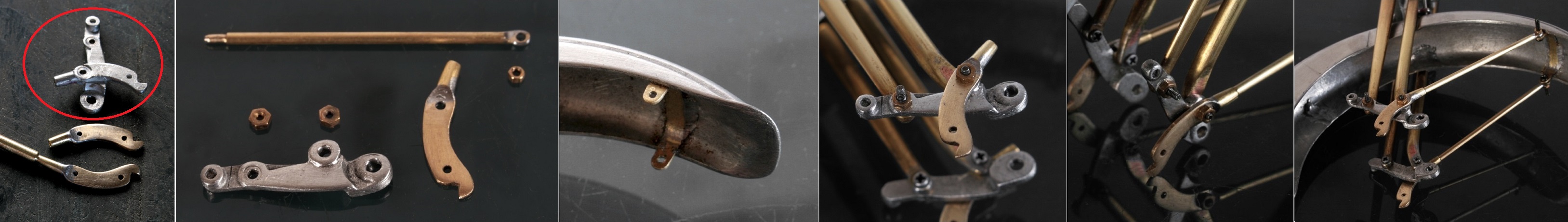 フェンダーが出来たところで、フェンダーを取り付けるステーがキットのままでは、写真左の赤丸のように部品が一体化しており可動できないことに気がついた。別に可動しなくたってよいし、面倒くさいのだが、折角なので実車と同じ構造になるように真鍮版で別部品を作り、可動できる構造に作り直した。