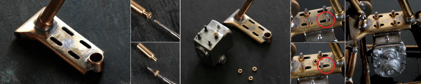 可動部を取り付けてみてから気がついたのだが、リアフェンダーの取り付け部分(写真左の赤丸印)が可動部分側についていないと、構造上可動することができない。そこで、真鍮製のΦ6mmワッシャーがあったので、そこに真鍮板から三角形に切り出した部品を半田づけし、最初に作った部品に合うように加工して、これも半田付けする。