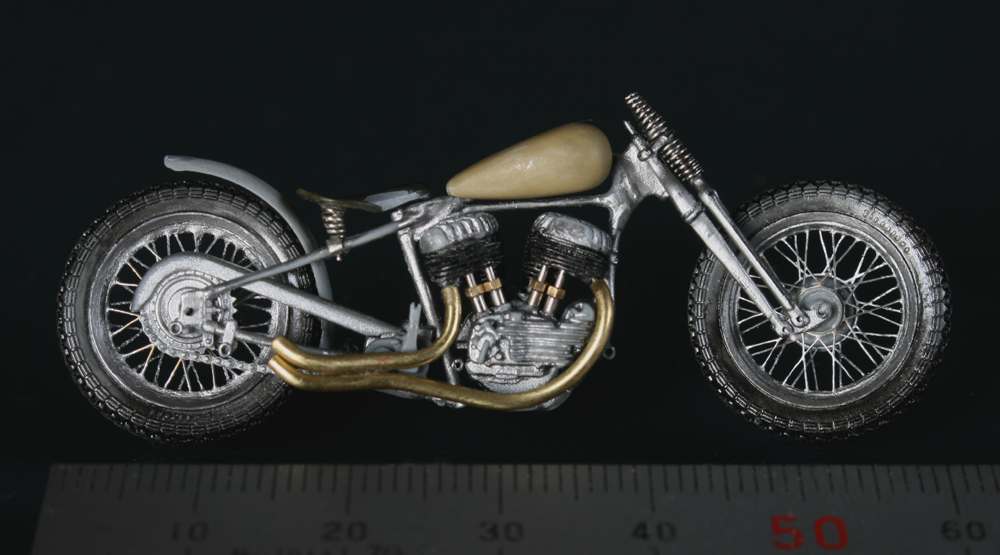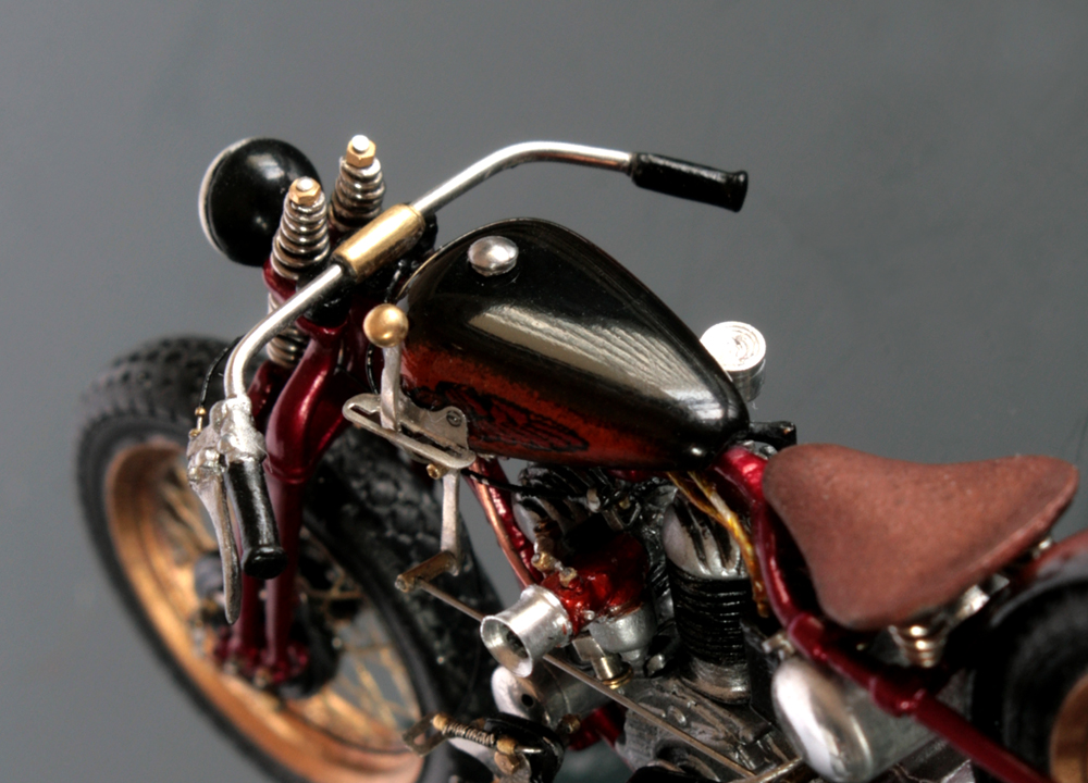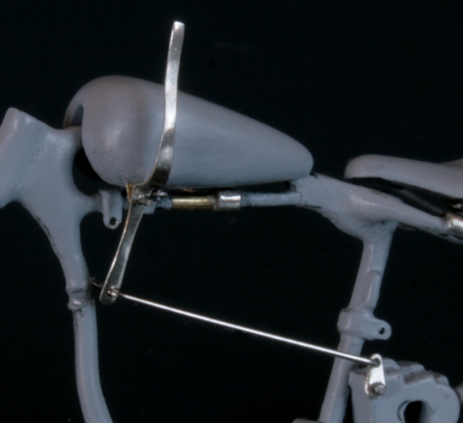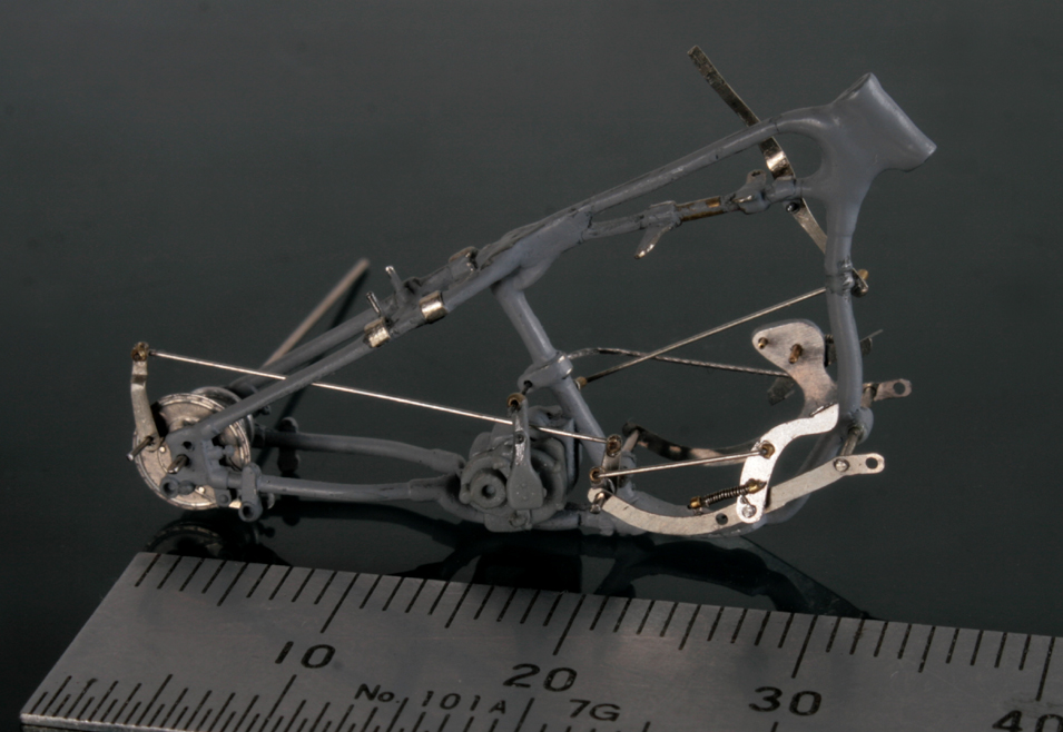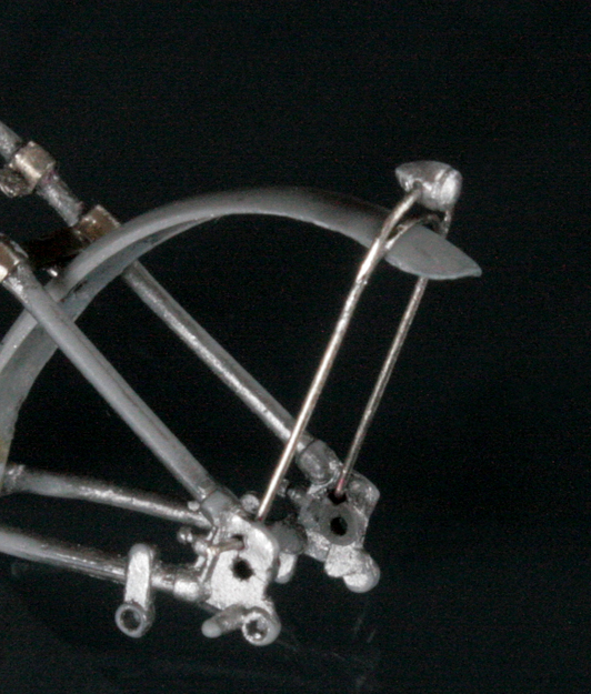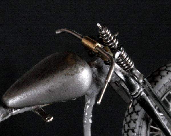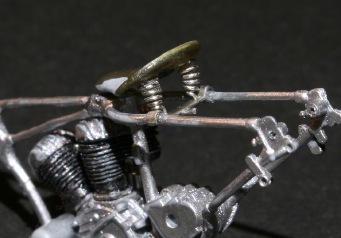 サドルは周辺を切り取って幅と長さを縮め、パテで形を整える。ミニアートのシートは柔らか過ぎたので、イタレリのキットのサドルで作り直した。バネは0.3mm洋白線を手巻き。