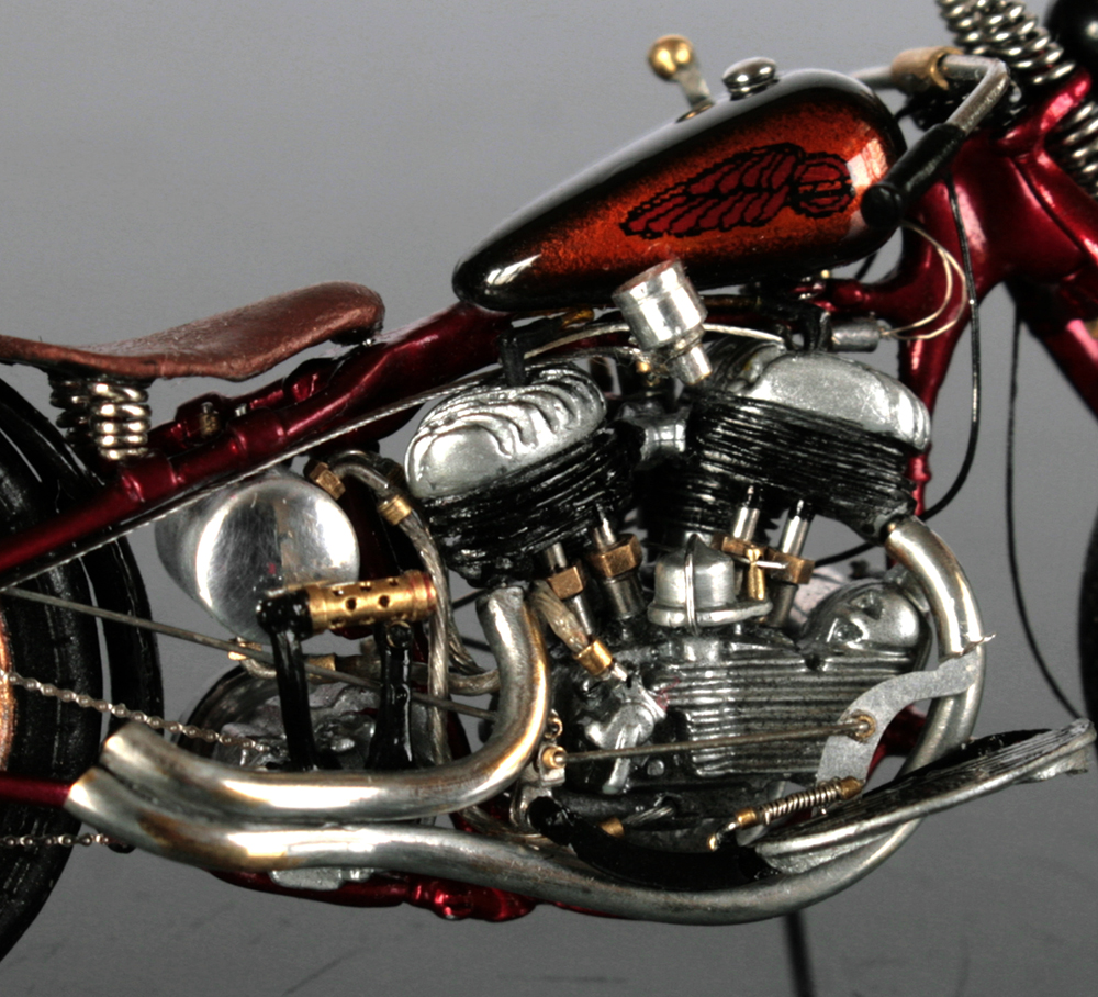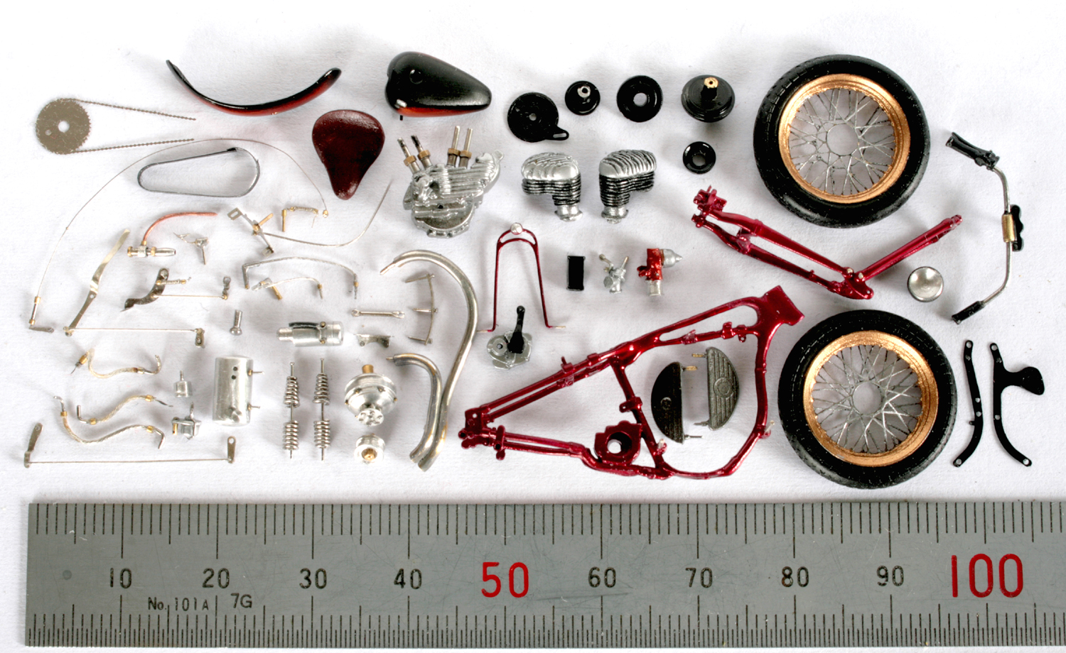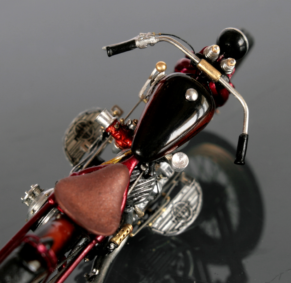 サドルは周辺を切り取って幅と長さを縮め、パテで形を整える。ミニアートのシートは柔らか過ぎたので、イタレリのキットのサドルで作り直した。バネは0.3mm洋白線を手巻き。