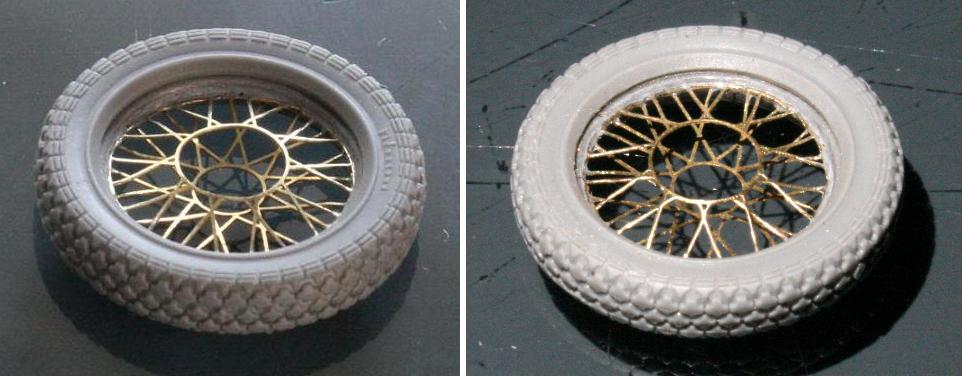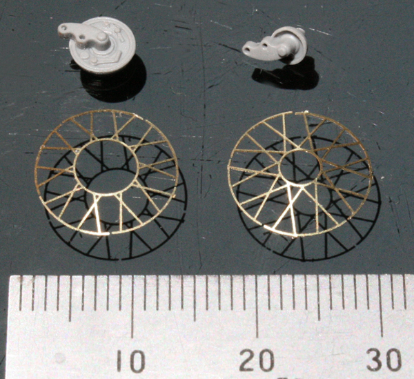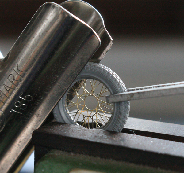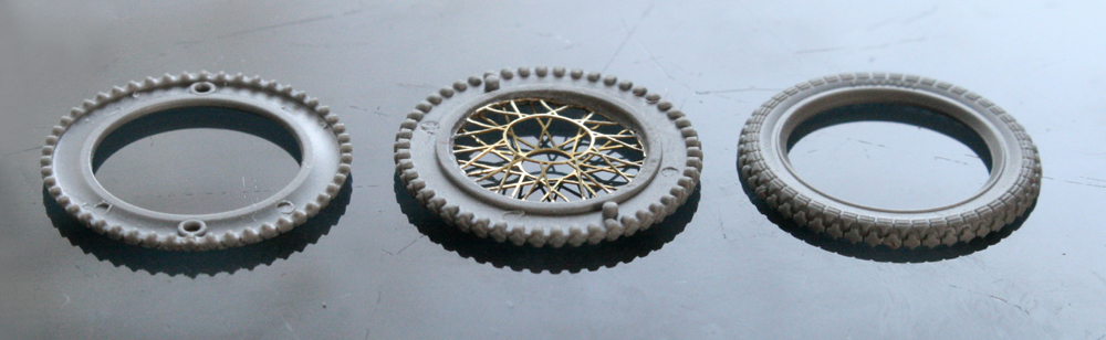 キットのエッチングを使用して、サンドイッチ方式のタイヤを組み立てる。エッチングスポークもなかなかよいが、0.2mmと太く、また、棒状ではなく平らなのが分かってしまうので、エッジを落とすように削ってみた。ガタガタに見えるのが気になる。塗装段階で修正できるだろうか…