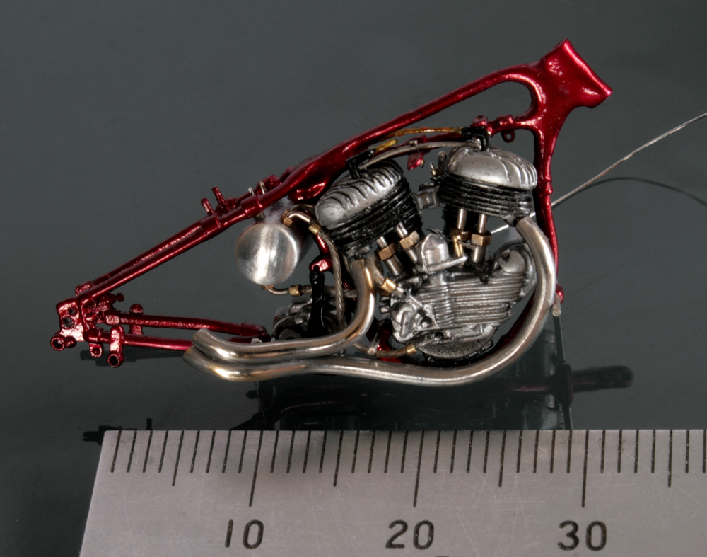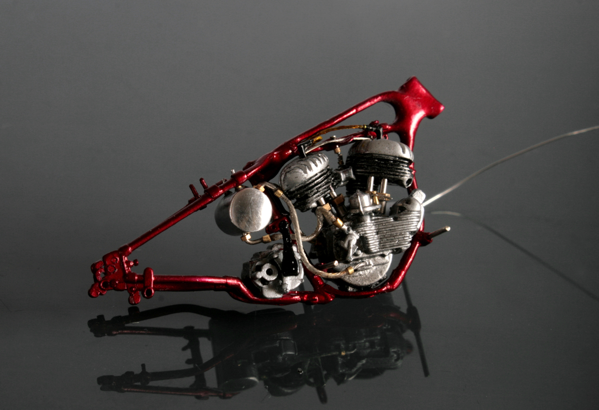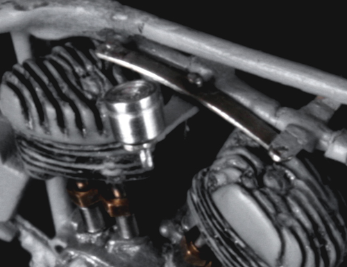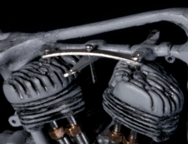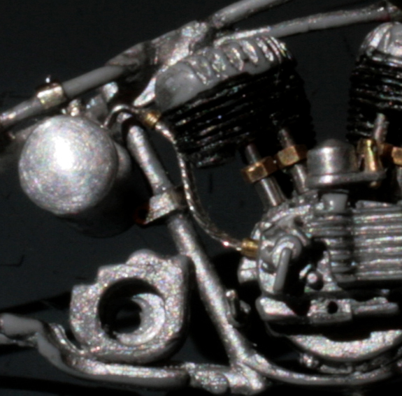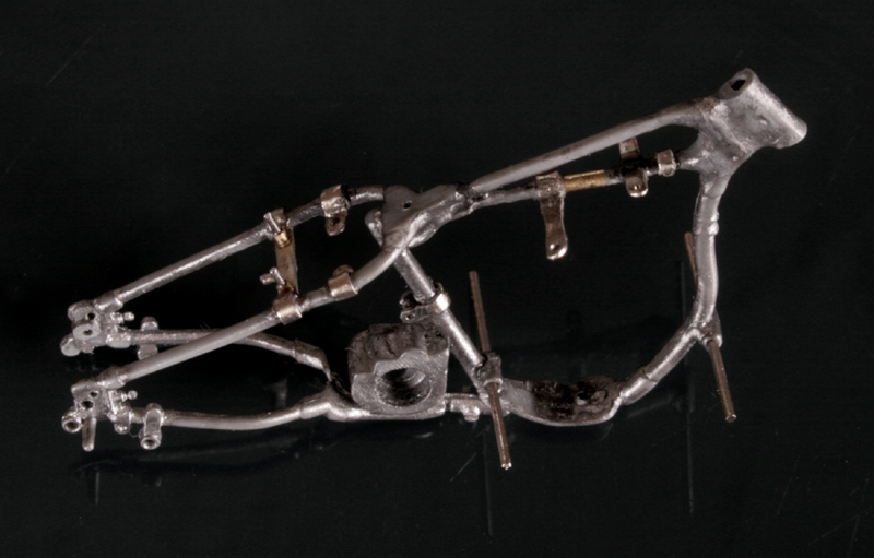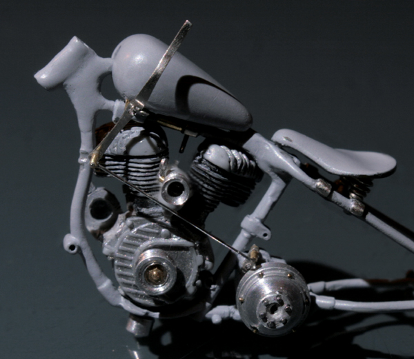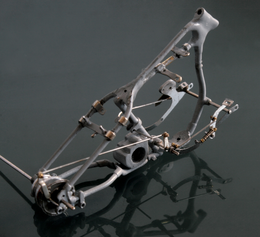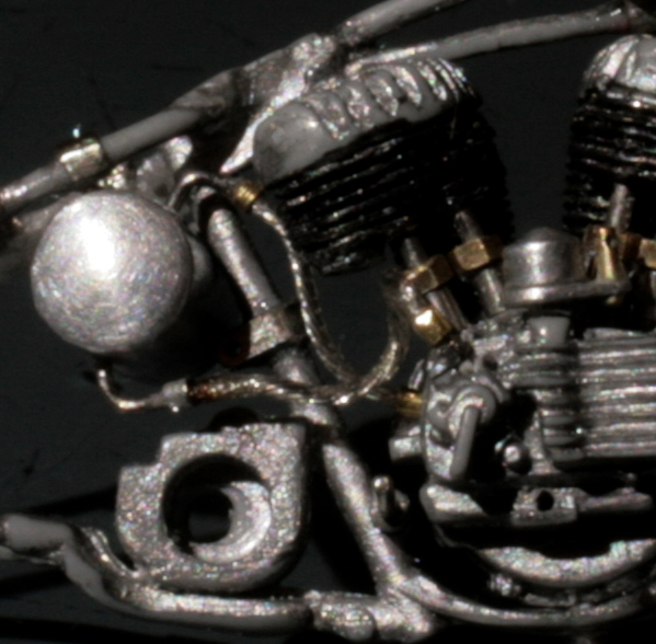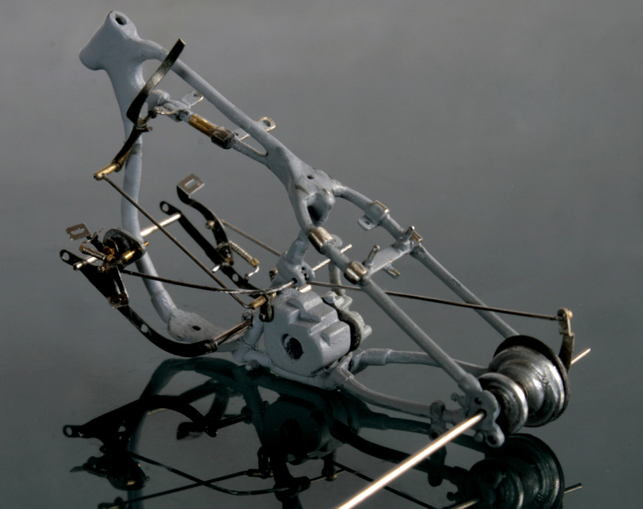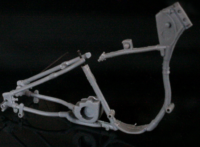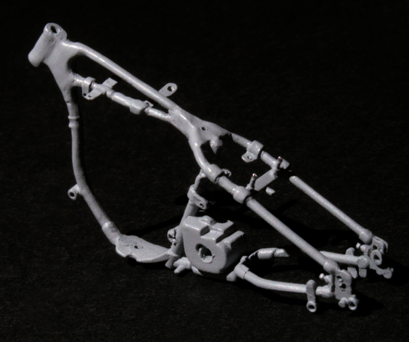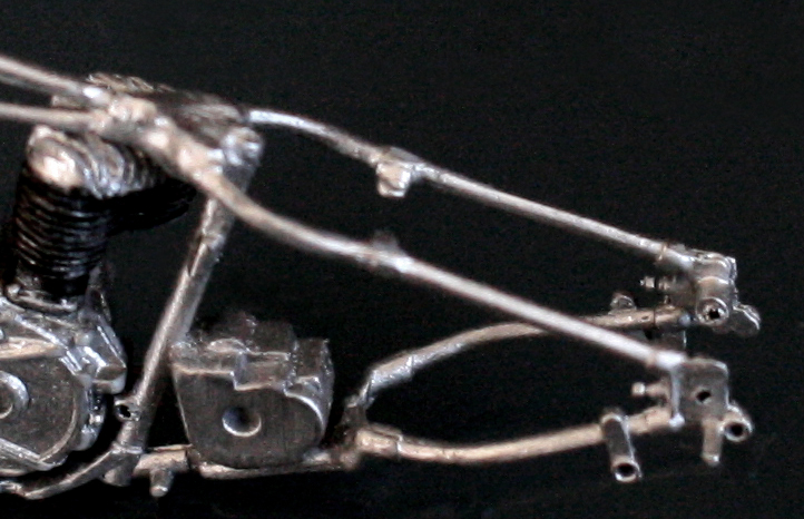 次にフレームを修正。キットでは一体となっていたエンジン下部は切り離し、1/9 の時と同じようにシート下のフレームを削って高さを低くする。さらに、後部のフレームが湾曲してしまっているので、0.2mm洋白板でサドルを取り付けるステーを作り、それをフレーム間にはめ込むことで歪みを修正。ステーにはリアフェンダーとりつけ部分を、0.5mm洋白線の先を潰して半田付け。段々小さい部品作製に目が慣れてきた。