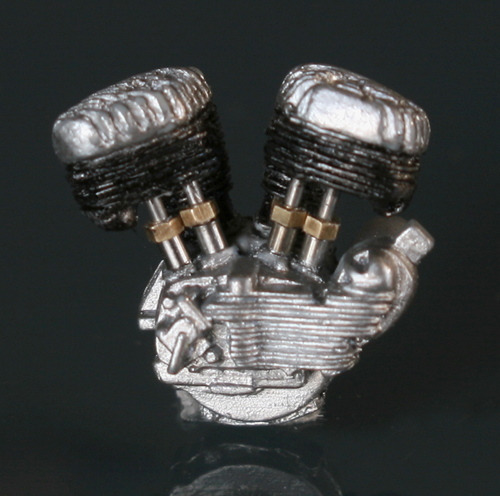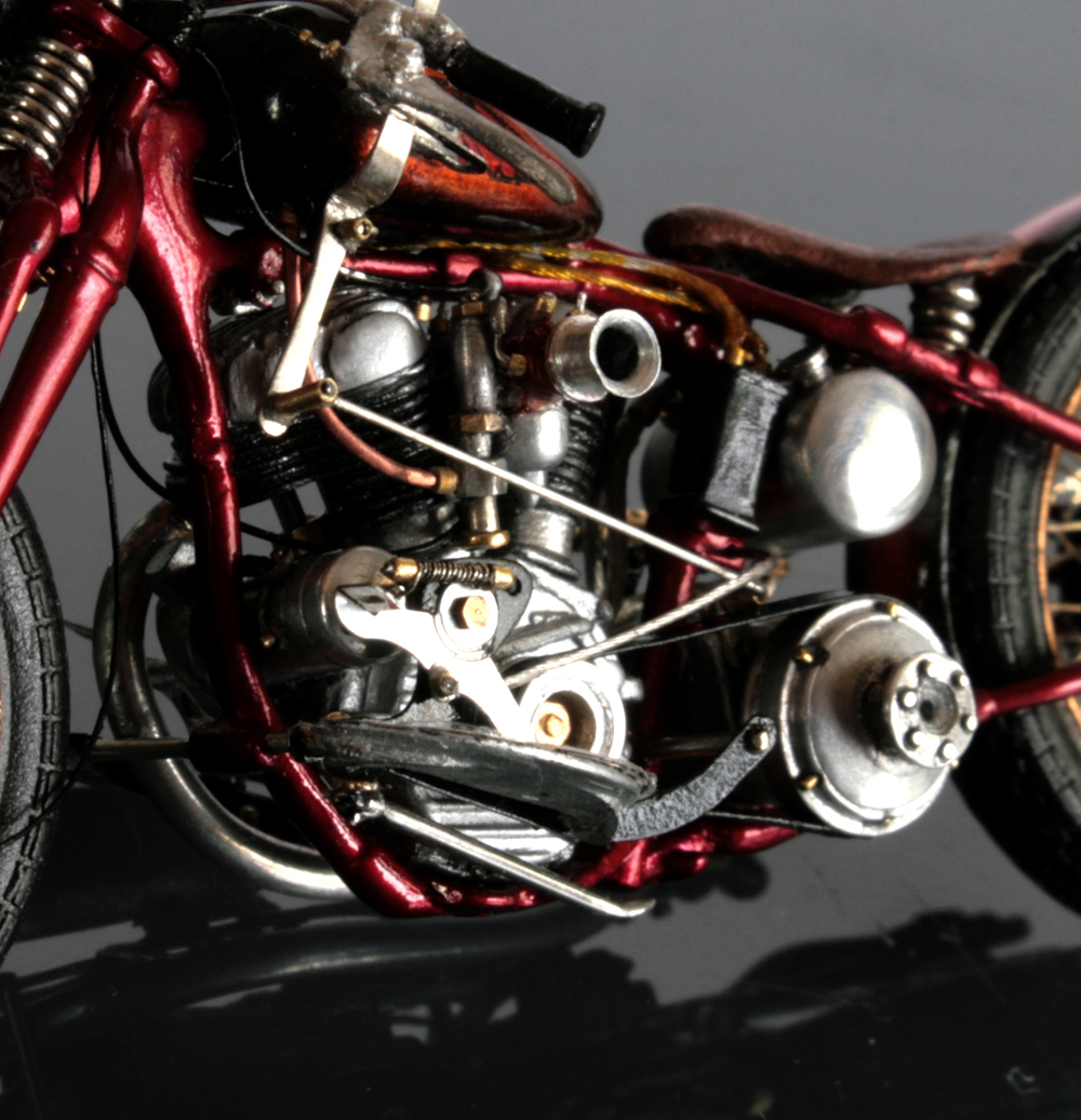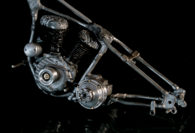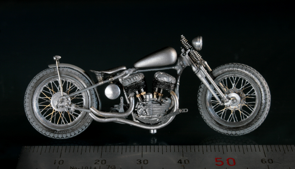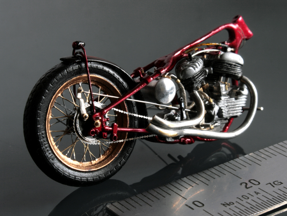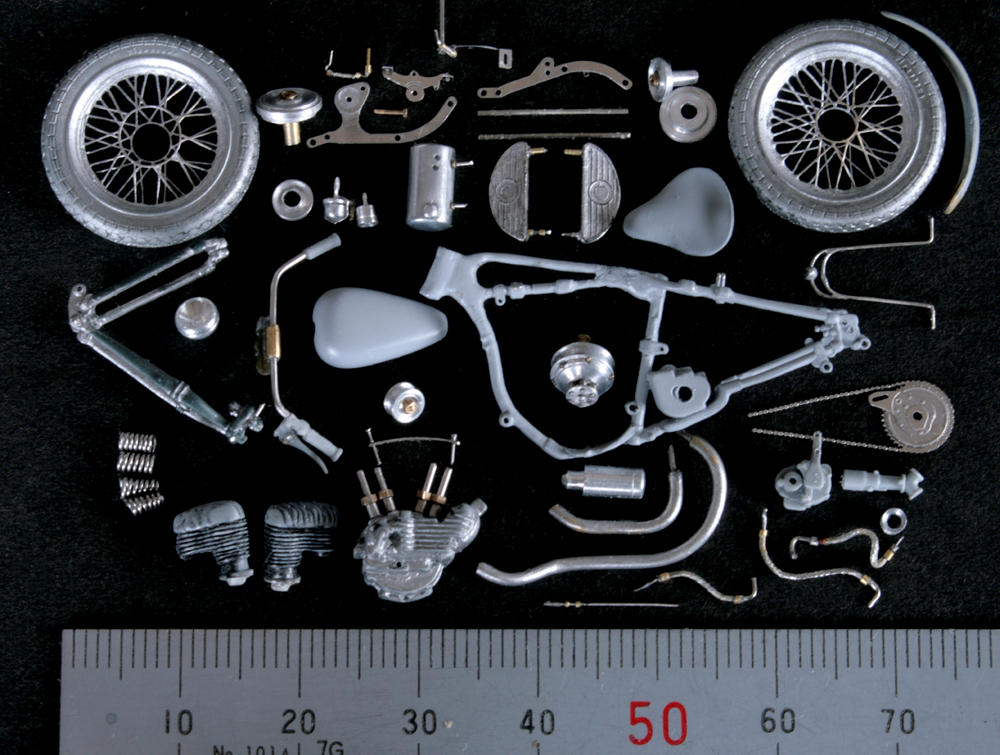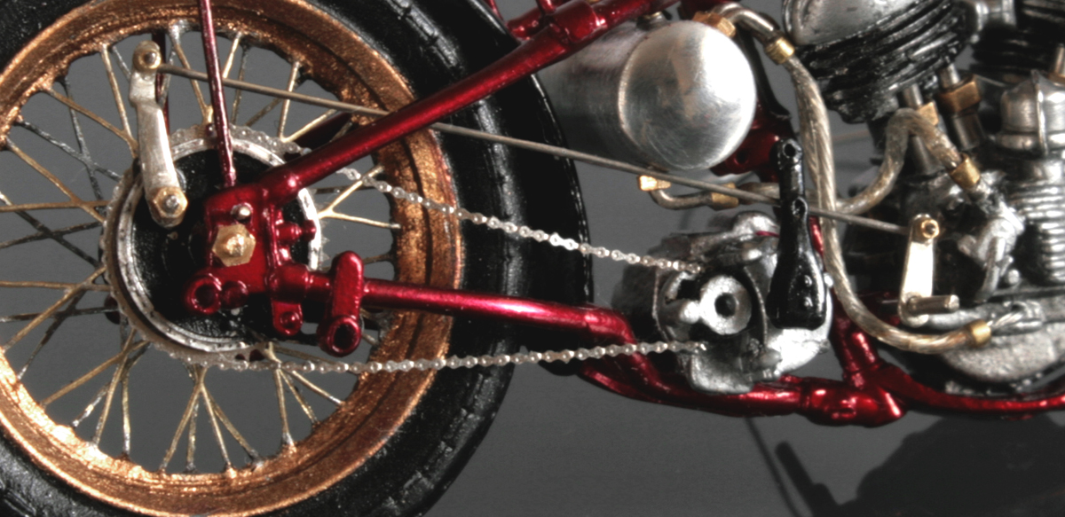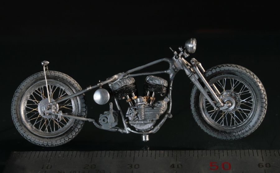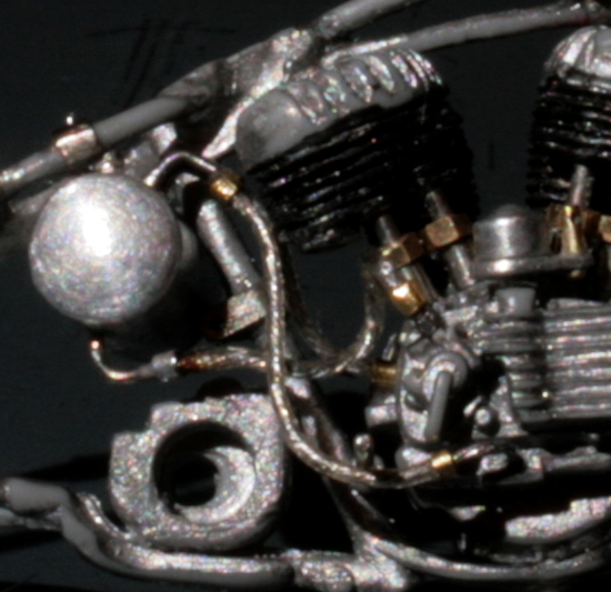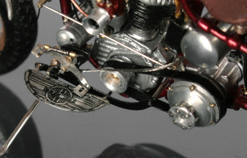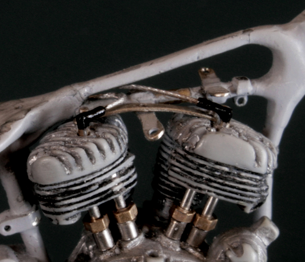 次にフレームを修正。キットでは一体となっていたエンジン下部は切り離し、1/9 の時と同じようにシート下のフレームを削って高さを低くする。さらに、後部のフレームが湾曲してしまっているので、0.2mm洋白板でサドルを取り付けるステーを作り、それをフレーム間にはめ込むことで歪みを修正。ステーにはリアフェンダーとりつけ部分を、0.5mm洋白線の先を潰して半田付け。段々小さい部品作製に目が慣れてきた。