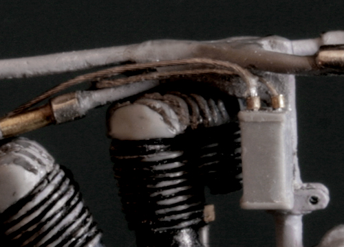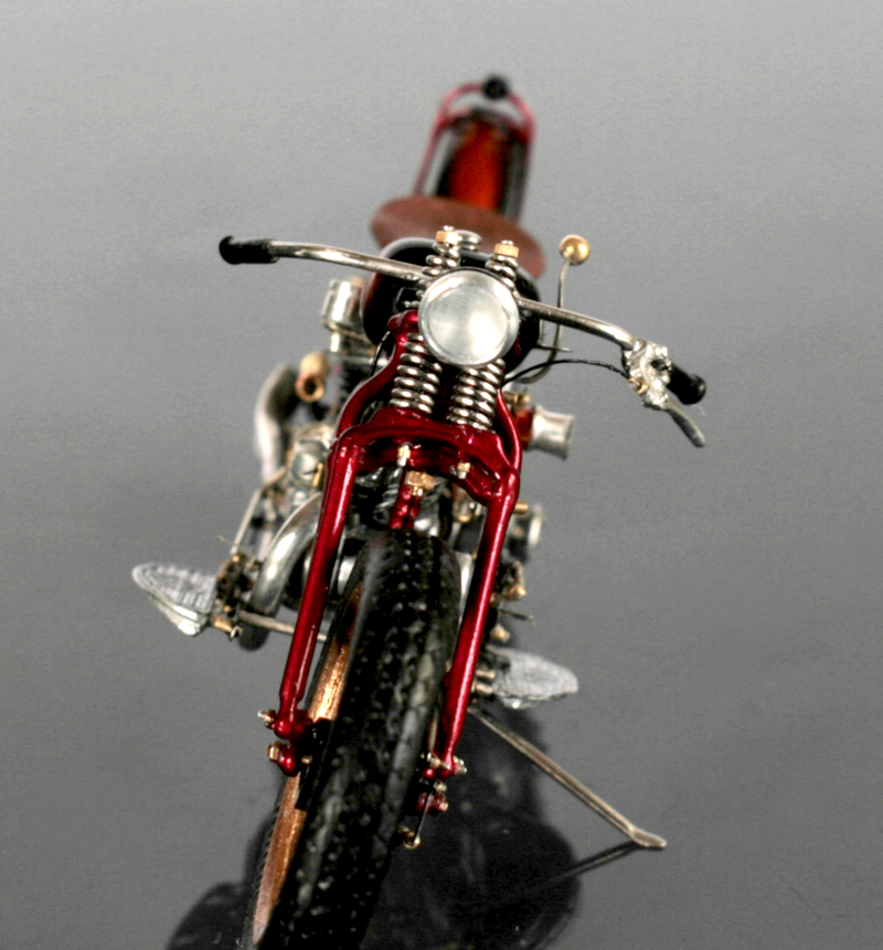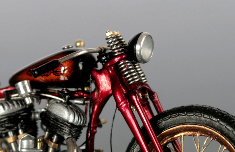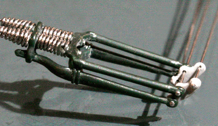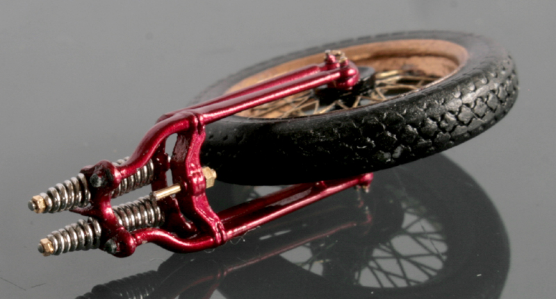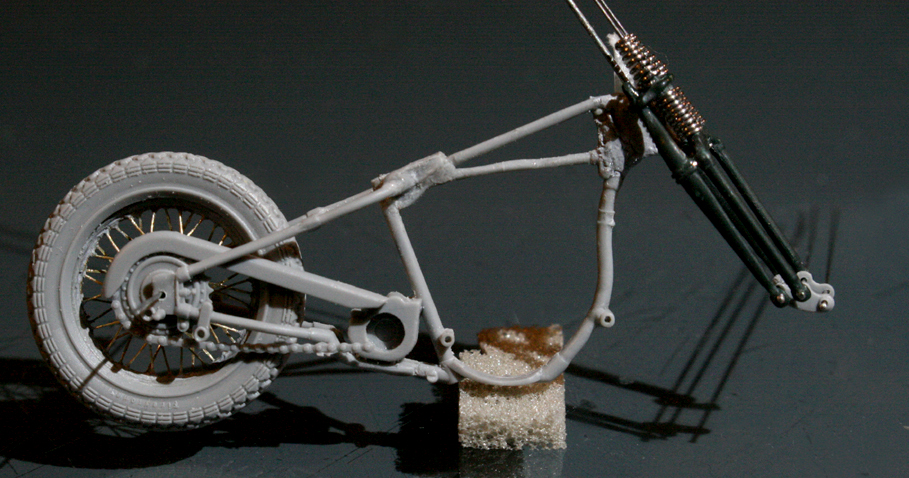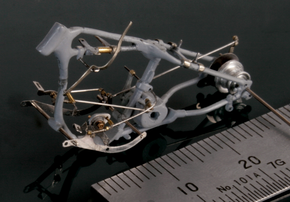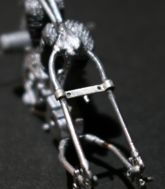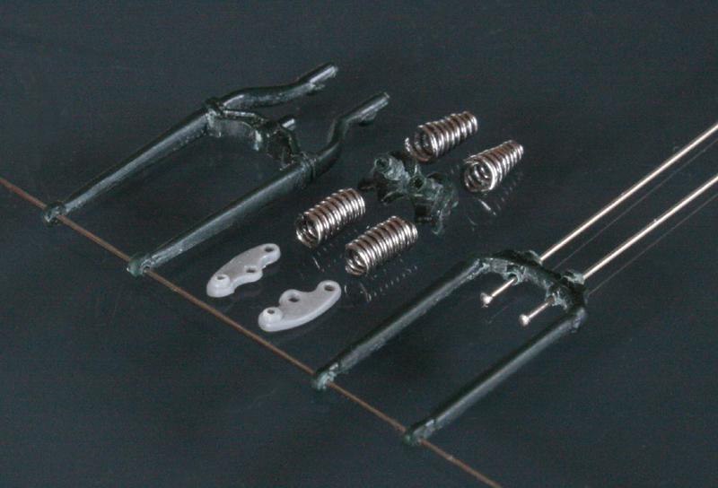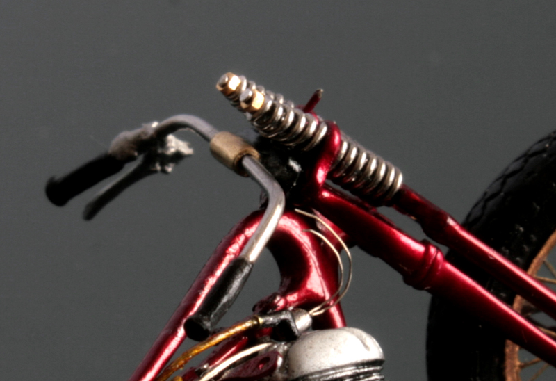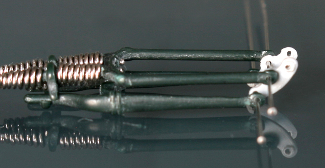 フロントフォークは、ミニアートのものは角ばり過ぎ。そして、これも素材が柔らかすぎて加工が難しいので、イタレリのキットのものを使用。バネは0.5mm洋白線。ちょっと巻き数が多すぎか…