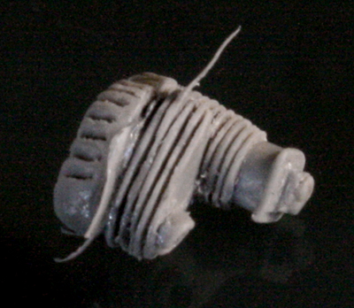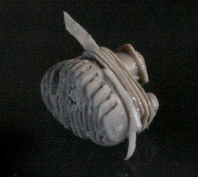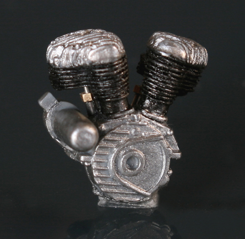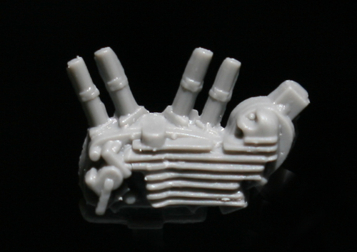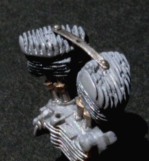 次にエンジン製作。写真のようにキットのエンジンフィンは酷く潰れて歪んでいるので、フィン間の溝を掘り直し、さらに、ランナーを薄く削り採った0.1mm薄のプラ版(?)でフィンを作る。拡大写真だと大して歪みが直っていないように見えるが、塗装してしまえば(そして実物は小さいので)それなりに見える。