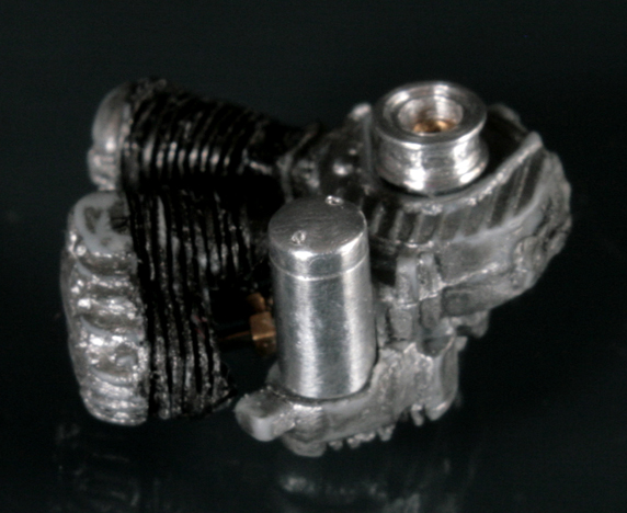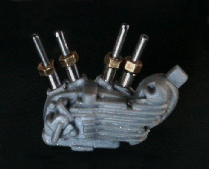 エンジン下部エキパイ側も、キットの状態ではフィンの右側が角ばっており、形状もおかしいので削り、ロッドも 0.6mmと0.9mmのステンレスパイプに置き換え、さらに 1mmの六角ナットも付け加えた。ジェネレーターの形状も正確な円筒になっていないので作り直さないとね。