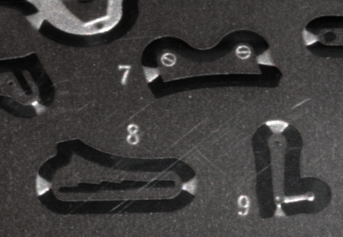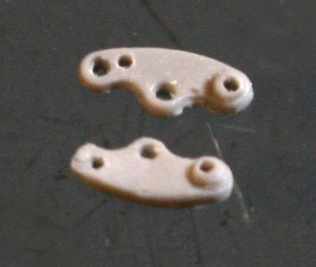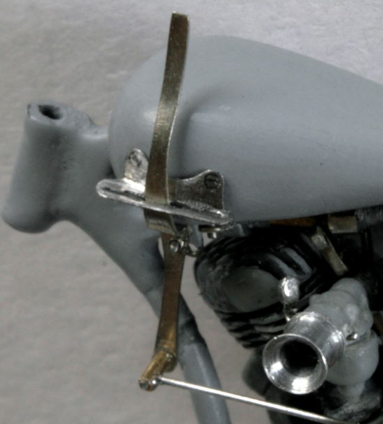 ギアチェンジレバーをタンクに留めるステーも作らないとね。これがやっかい。Swash Design のエッチングパーツは写真の 7 と 8 のように2つのパーツ構成となっている。塗装した後に取り付けるには、一つの部品としておきたいところ。そこで、まずキットのパーツ(真鍮エッチングで8の部分のみ)でハンダ付けできないか実験してみる。0.2mmの真鍮版を適当な大きさに切って、ハンダ付けしてから整形(途中過程の写真なし。ちょ~集中していた)。