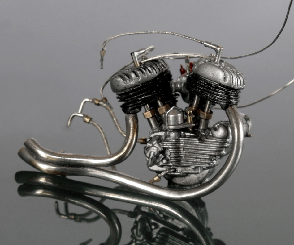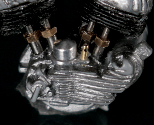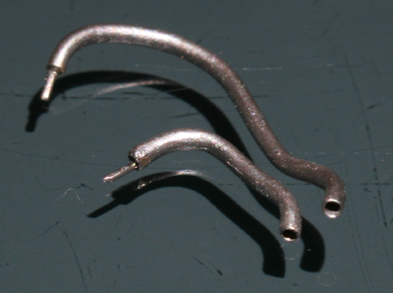 エキパイは形状が複雑なため硬いステンレスパイプでは作れない。太さも丁度良いものがないので、1.2mm径の真鍮パイプをペンチで曲げて作る。小さいので傷がついたり歪んだりするが、それらの部分に半田を盛って修正。メタルカラーを筆でさっと塗ってデコボコが無いか確認。極小部品には、メタルカラーがサーフェーサーよりも手軽で便利です。