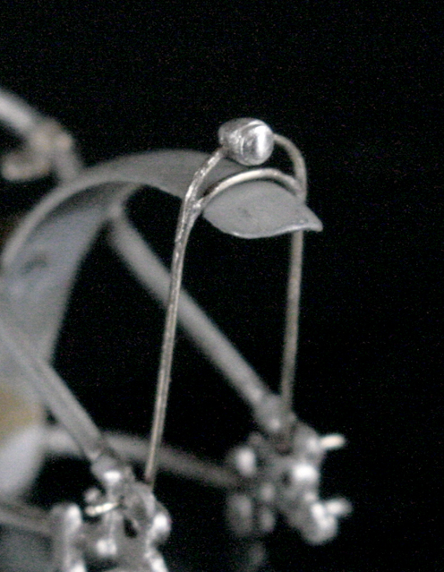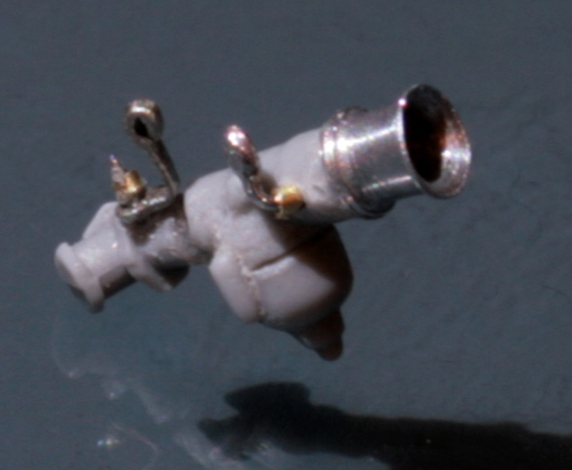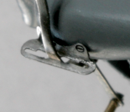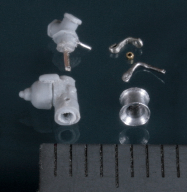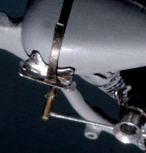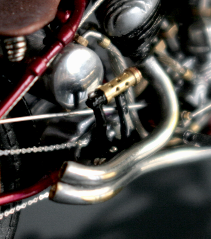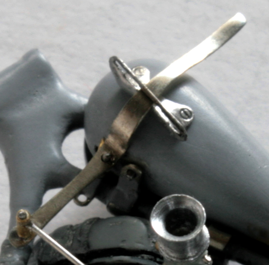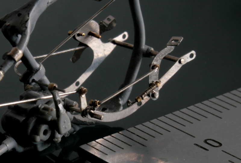 濃度調整のレバーは0.3mmの洋白線を曲げ、先端にハンダを盛る。レバーの先端をさらに細く削ってキャブの穴から調整ニードルが見える状態にする。アクセルワイヤーの取り付け部分は、0.2mm厚の洋白板を曲げて作成。0.5mm真鍮パイプを幅0.5mm程度に切ってネジに見立てて留める。