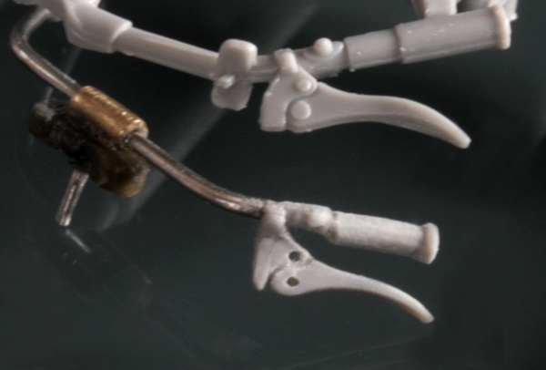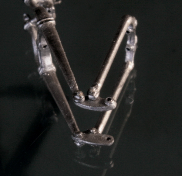 キックペダルやは1mm真鍮パイプに0.3mmの穴を3つと2つの交互に開けていく。それをキットの部品に取り付ける。フロントブレーキのステーはSwash Designのエッチングを加工。ブレーキとフロントフォークの連結部分はステンレスパイプの両側を潰して穴を開ける。