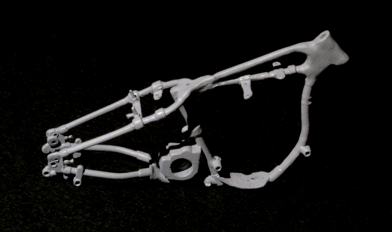 フレーム側にもステーを取り付け、ほとんどのステーを加工し終えたので、フレームにサーフェイサーを吹いて歪みや凸凹の様子を見てみる。まぁまぁいい感じか…エンジンを吊るすステーとの接合部分も確認できたので、さらにスピードメーターもつけてみる。