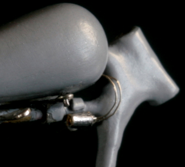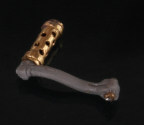 ハブが出来たところで、ガーダーフォークの先端部分を 0.3mm虫ピンと 0.5mm真鍮パイプで留める。
