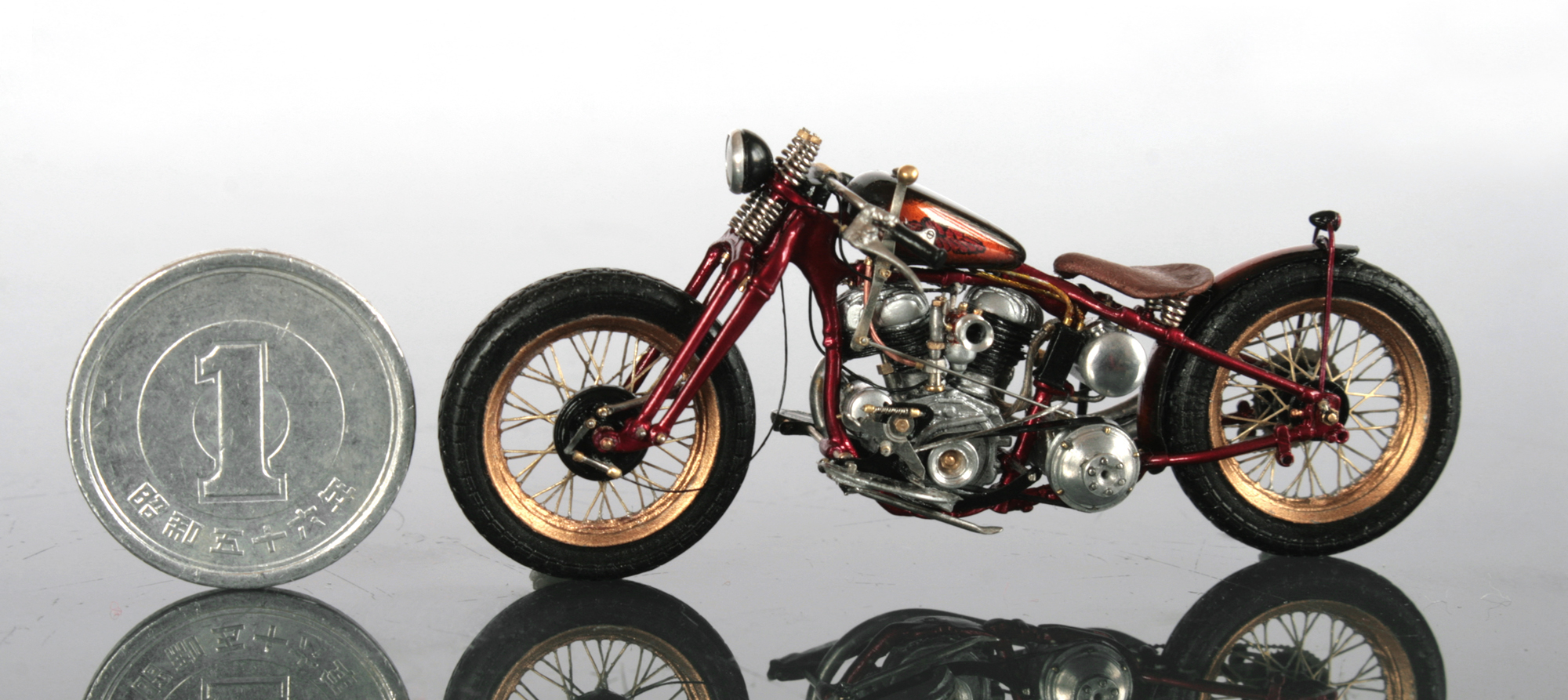 さらにヘッドライト(直径3.7mmが大きく見える)を削り出し、前後ハブ(ブレーキ)も作る。ハブは一体成形にするとエッチングチェーンを挟めなくなるので、左右別々に作ってはめ込めるようにする。