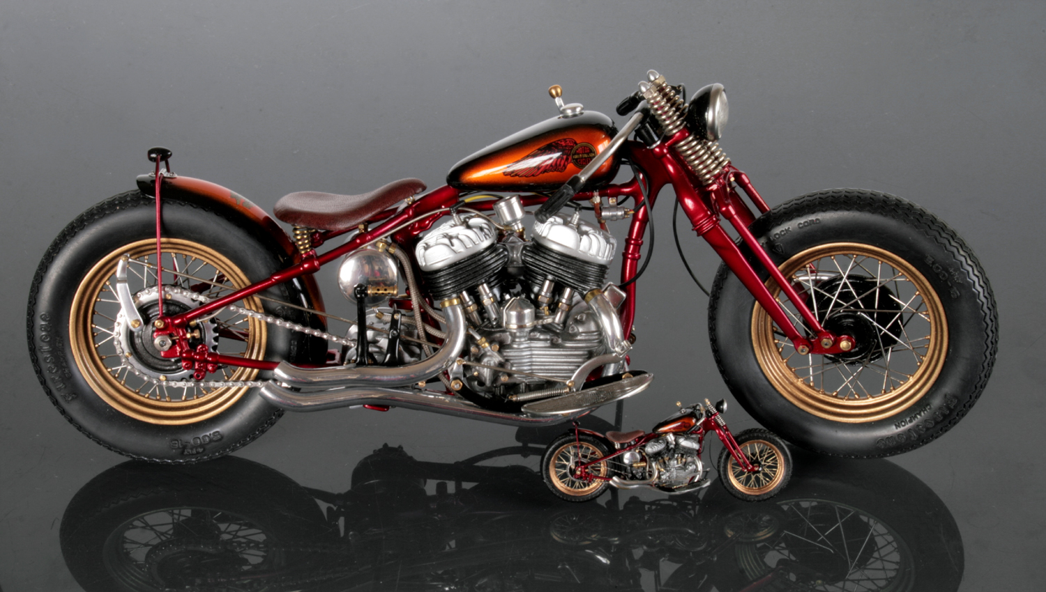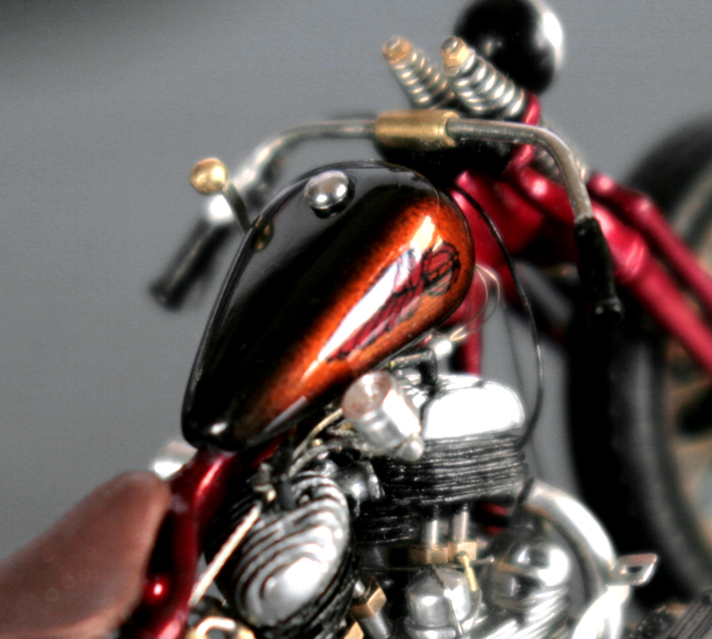 やっと塗装に入る。タンクとリアフェンダーの黒とメタリックオレンジのグラデーションは、部品が小さ過ぎて境目のラインが真っ直ぐにならない… 何回かやり直して、どうにか完成。