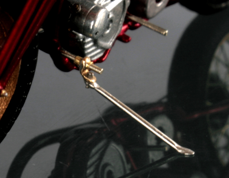 ここまで組み立てて、サイドスタンドを作り忘れていたことに気が付く。スタンドは0.5mmステンレスパイプの端を潰し、そこに半田を盛ってから接地部分を整形。フレームとの取り付け部分は真鍮パイプと真鍮板で作成。スタンドは可動式。