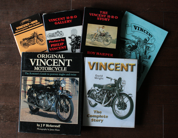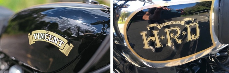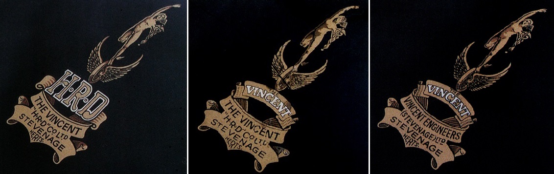 HRDは、1924年に、マン島TTレースで優勝したライダー、Howard Raymond Davis が立ち上げた英国の会社。しかし経営難となったため、1928年にPhilip Vincent が会社を買い取り社名がVincent HRDとなった。(下記の本を参照)また、その経緯はタンク上部のマークの変遷を見ても分かる。タンクマークは古い順に左から、HRDがメイン、Vincentがメイン、右ではHRDが無くなっている。HRDの名称を次第に無くしていったのは、HDがアメリカのHarley Davidsonを思い起こすからという理由らしい。